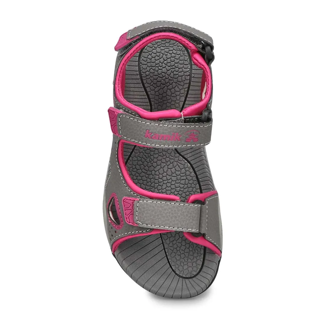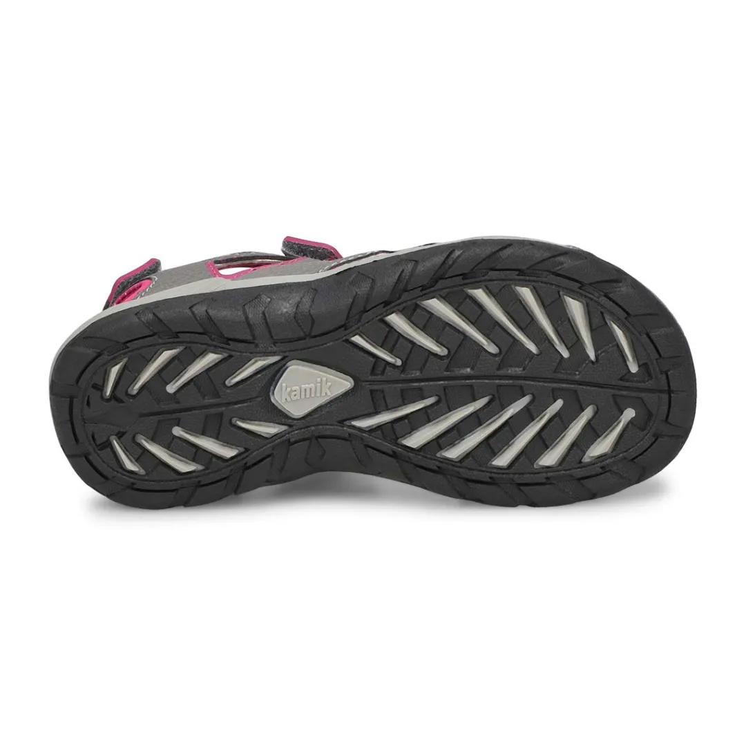 Bring on the heat wave with Lobster 2 dark grey/ pink 3 strap sport sandal from Kamik. These kids’ sandals keep feet fresh, cool and dry, thanks to an odor-control-treated footbed and breathable, moisture-wicking materials. Ideal for chasing bubbles and racing to the pool, these sandals for kids have three adjustable straps for a comfy and snug fit.