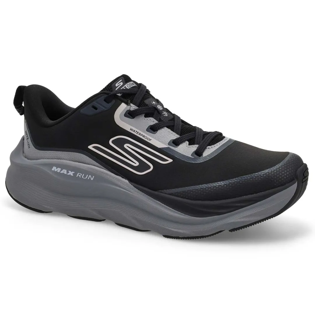 Maximize your comfort potential on each and every run wearing the Max Run Vorteza slate Waterproof Performance Sneaker from Skechers. This waterproof running lace-up features a reflective woven fabric and synthetic upper, a Skechers Air-Cooled Goga Mat insole, Max Cushioning midsole with responsive ULTRA LIGHT cushioning, and an anti-slip Goodyear Performance outsole.