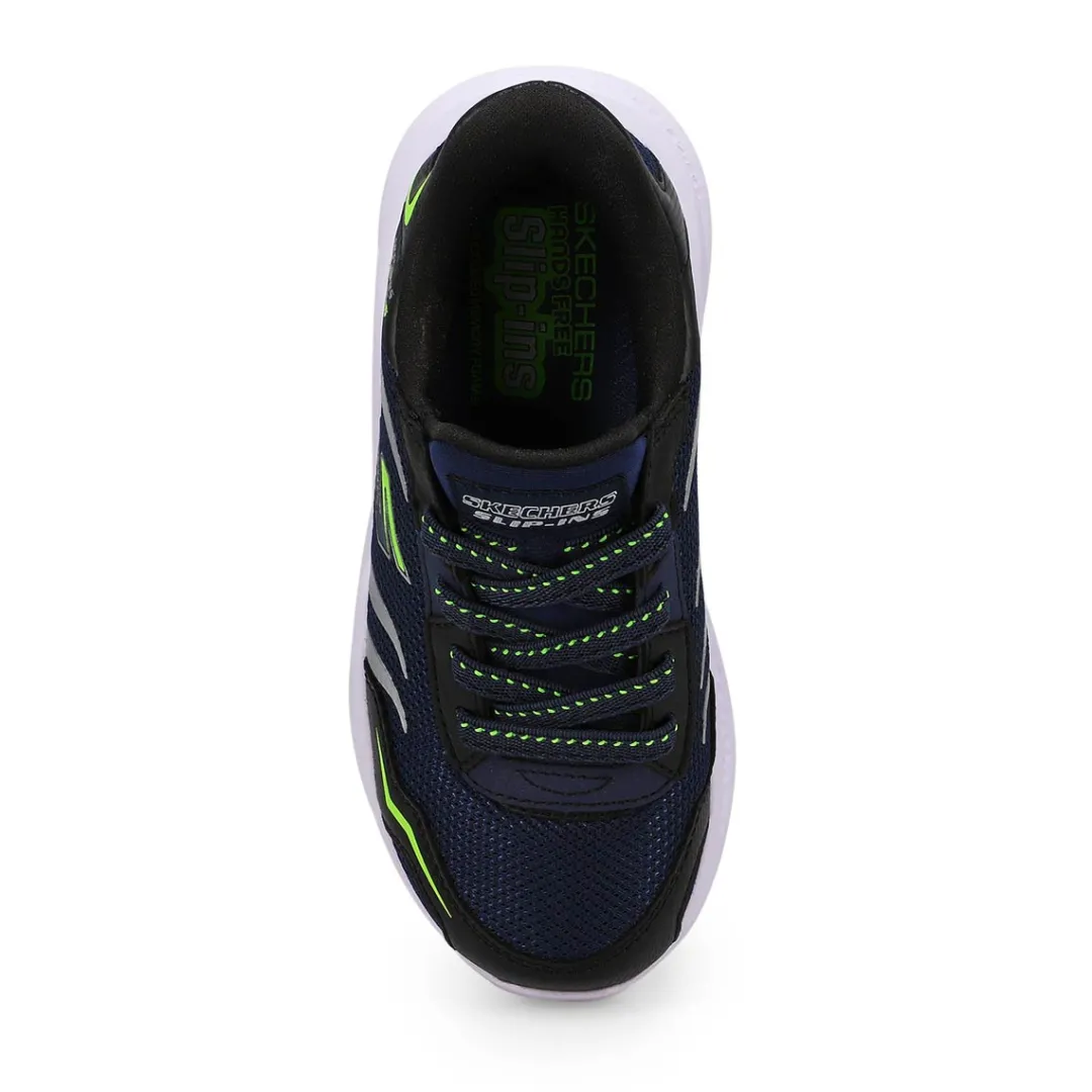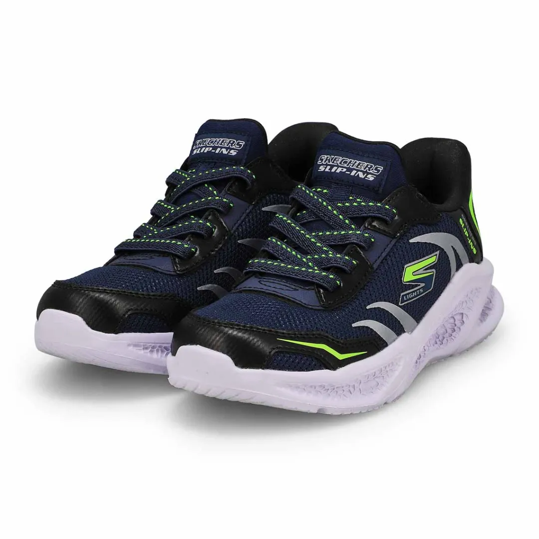 Illuminate your steps in sporty style and comfort with the Hands Free Slip-ins S-Lights: Meteor-Lights Brisk-Beams navy/ black sneaker from Skechers. Designed with Skechers’ exclusive Heel Pillow, this light-up slip-on features a mesh and metallic hotmelt overlay upper with stretch laces, Skechers Air-Cooled Memory Foam insole, and a shock-absorbing light-up midsole.