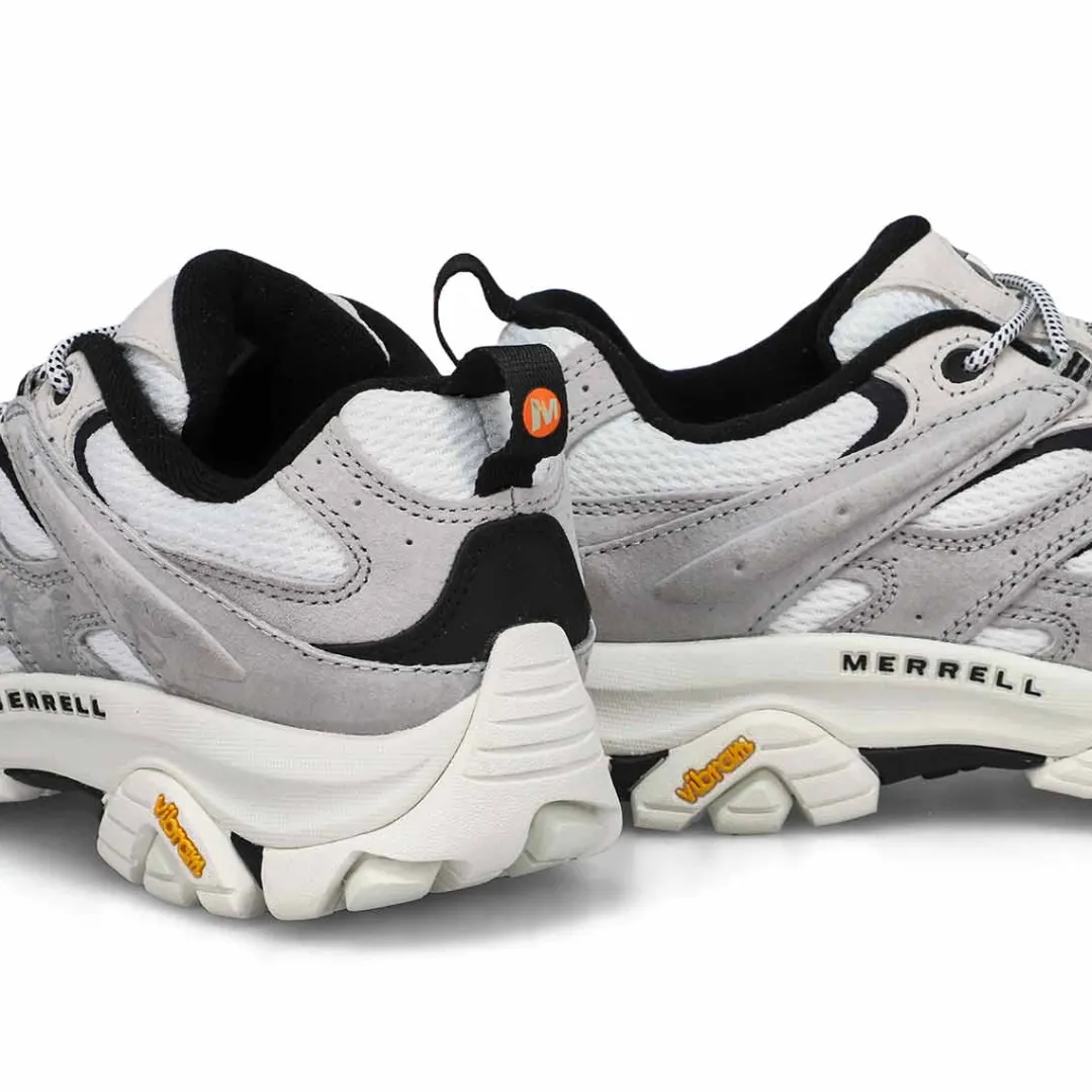 Experience out of the box comfort in the Moab 3 white/ black hiking shoe from Merrell. Suede leather and breathable mesh upper and a bellows tongue that helps keep out debris. Super Rebound Compound midsole provides durable shock absorption to help reduce torque and allow for a smooth transition into the midfoot. Vibram® TC5+ outsole provides exceptional traction for outdoor multi-sport activities, formulated exclusively for Merrell.