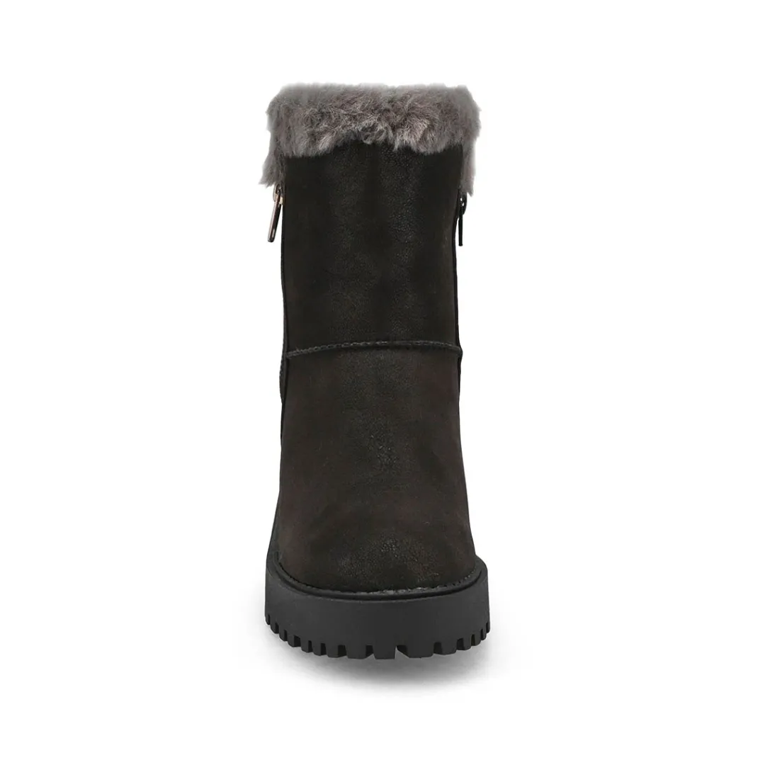 The Natalie Wedge Fur Trim synthetic leather casual bootie from SoftMoc is the perfect boot choice for your outfit that is demanding a cute and cozy look. Featuring a synthetic leather upper. A cushioned footbed to help create all day comfort. The Natalie boot is designed with a durable rubber outsole.