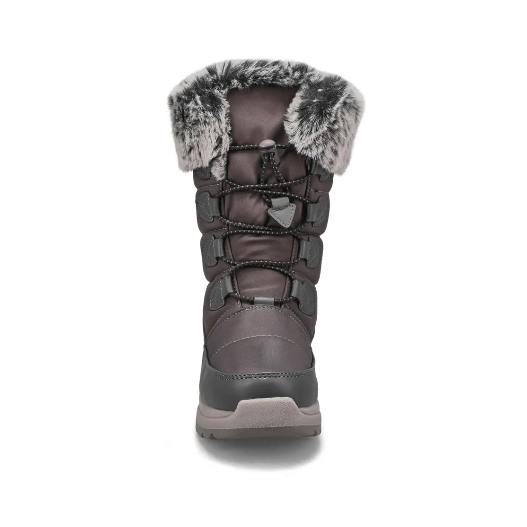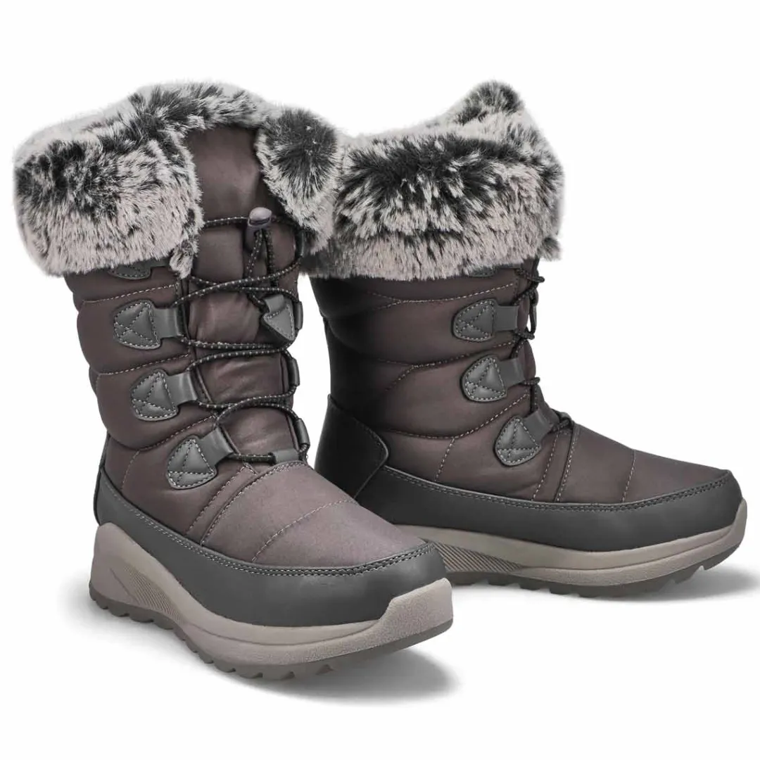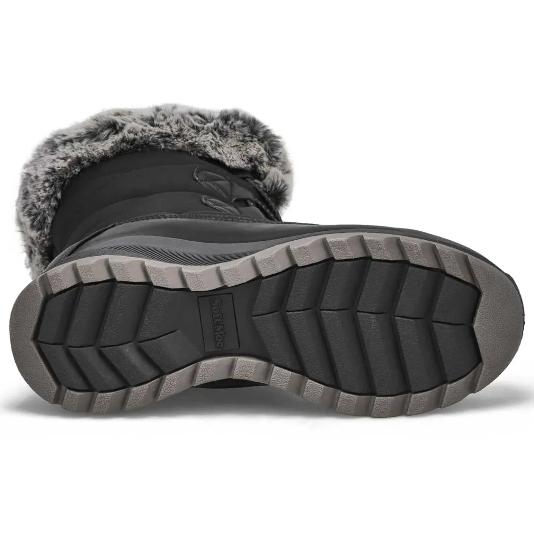 The Niobe charcoal waterproof boot from SoftMoc featurers a waterproof nylon upper with soft, faux fur collar and polar plush lining. Slip resistant traction outsole. Thinsulate insulation , built with lightweight construction in mind. You will want to make the Niobe charcoal waterproof winter boot part of your must-have list for this season!