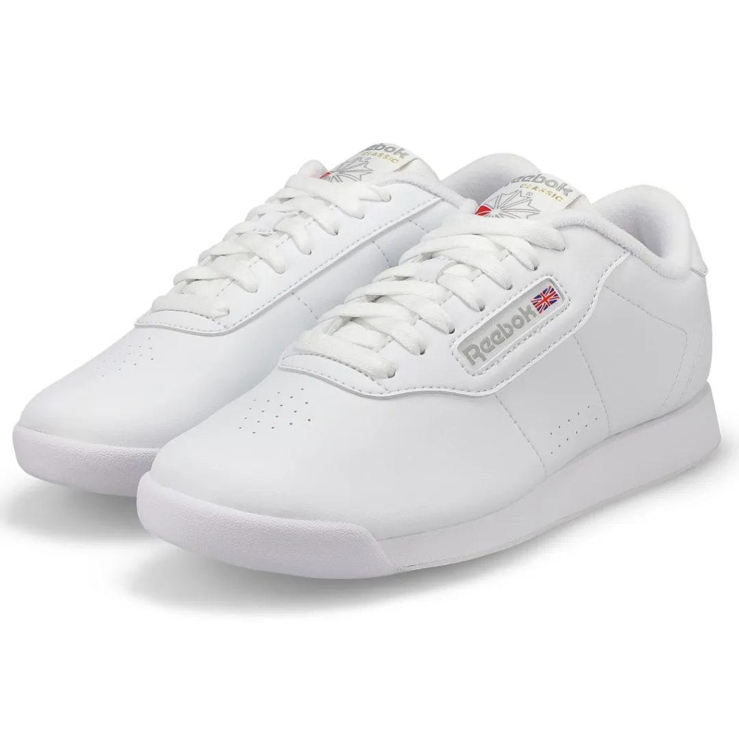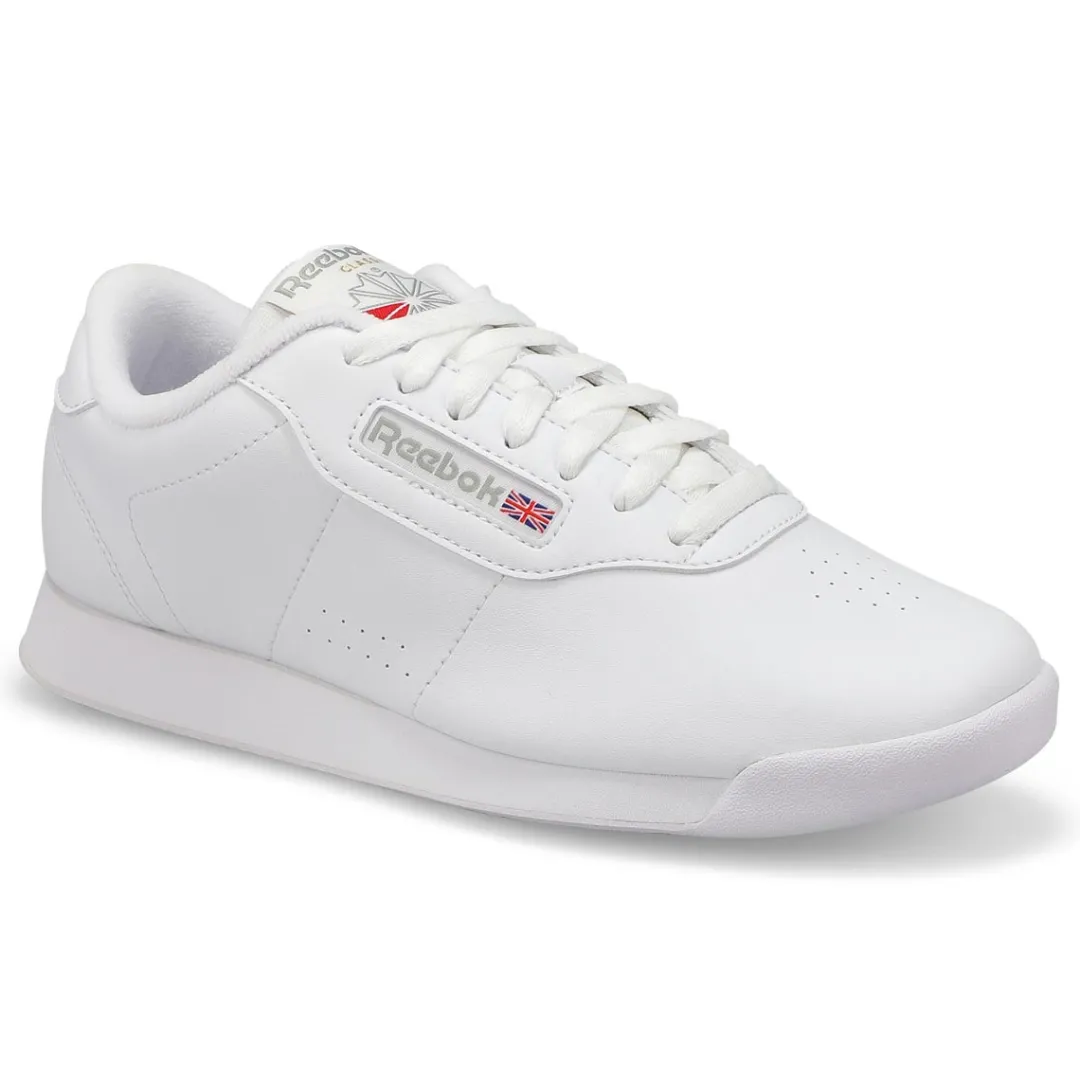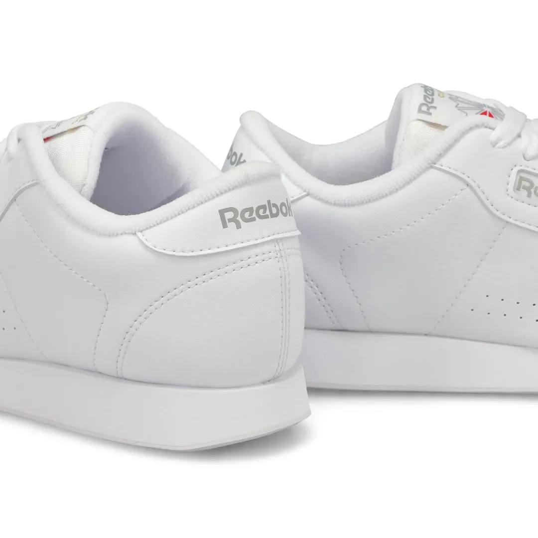 Between cushion and timeless style, let the Princess white synthetic leather lace up sneaker from Reebok cast its spell over you. You’ll fall hard for the clean upper design with subtle perforations and stitching. Featuring a synthetic leather upper. Soft terry lining/moisture absorption and comfort. Padded foam sockliner/comfort and cushioning. Padded foam sockliner adds cushion. Wide Width.