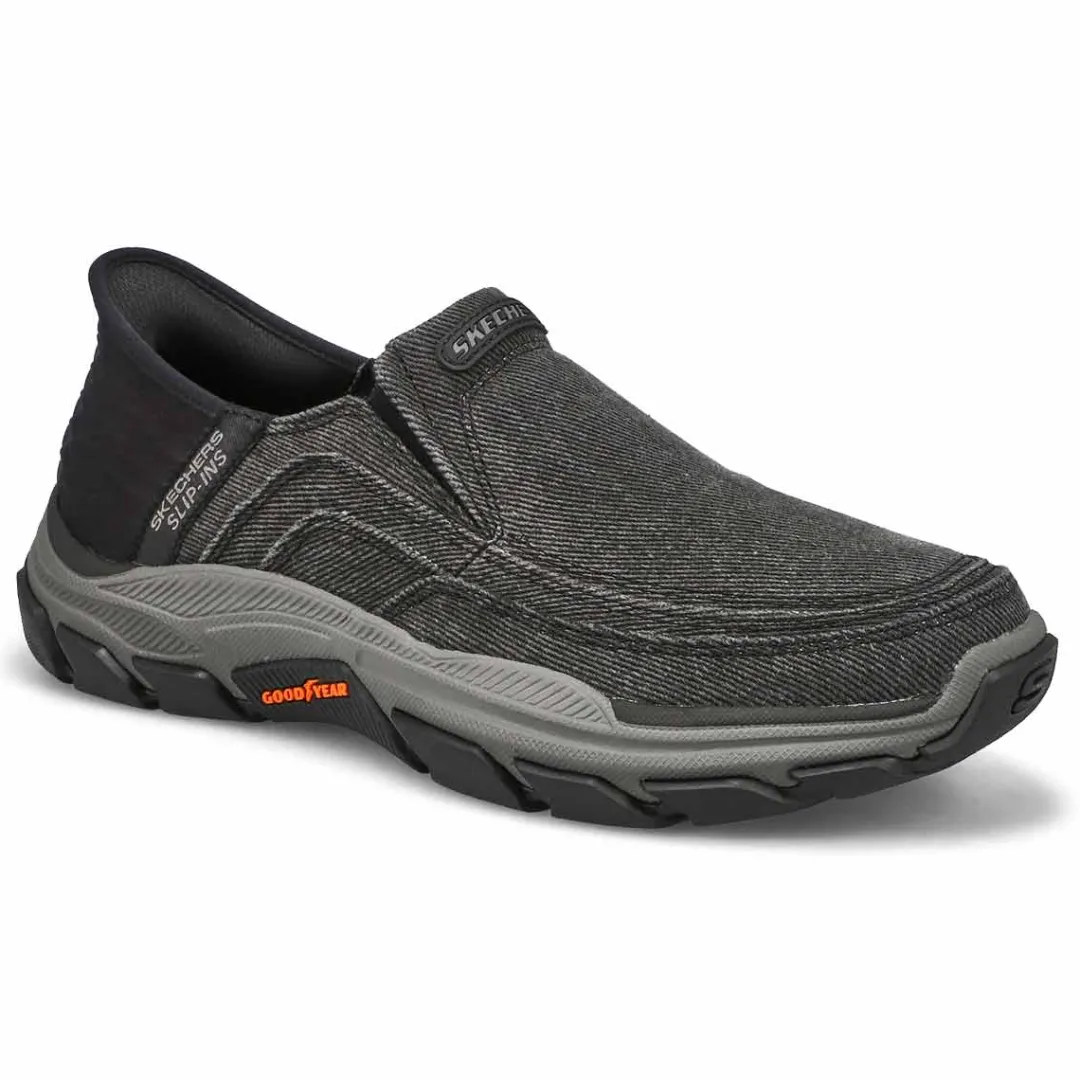 Simply step in and go wearing the Hands Free Slip-Ins Relaxed Fit Respected Holmgren black shoe from Skechers. Designed with our exclusive Heel Pillow. This laceless style features a canvas upper with twin gore panels for ease of wear, a Skechers Air-Cooled Memory Foam comfort insole, Goga Mat Arch cushioning and an anti-slip Goodyear Rubber Outsole.