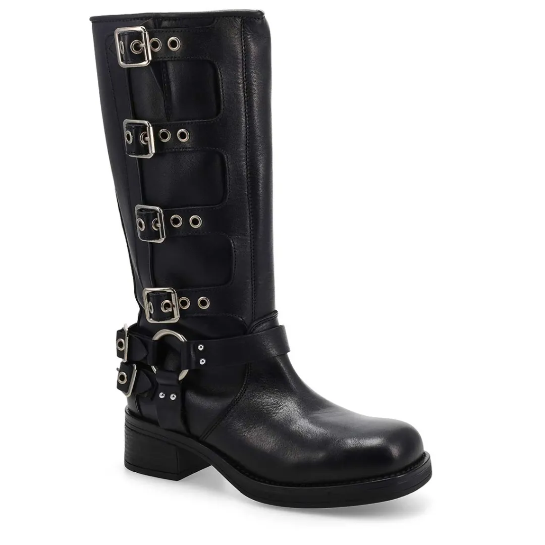 The Rockyy brown Knee High Boot from Steve Madden features the wide profile of an engineer boot with harness and buckle hardware adding an industrial edge and giving the design an adjustable fit. Top gore with 4 adjustable buckle straps. Block heel engineer boot design. Leather upper with breathable textile lining.