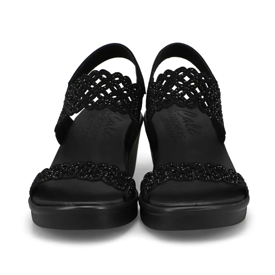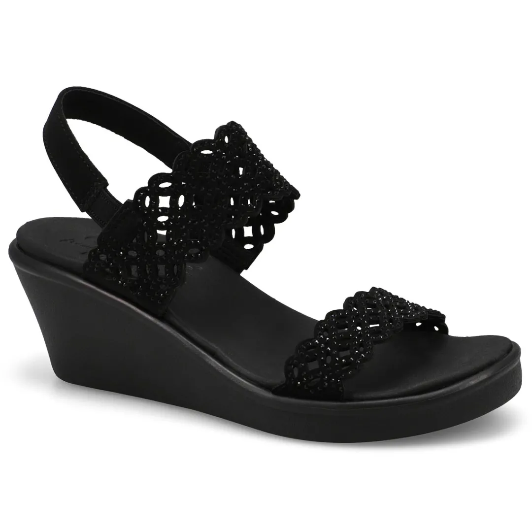 Glam style comfort and looks combine in the Rumble On Sassy Dayz black/black Wedge Sandal from Skechers. This wedge sandal features a rhinestone embellished laser cut vegan leather upper with a pull-on slingback strap and a cushioned Luxe Foam footbed. Match warm-weather style with toe-to-toe comfort from Skechers contoured well-cushioned Luxe Foam footbeds.