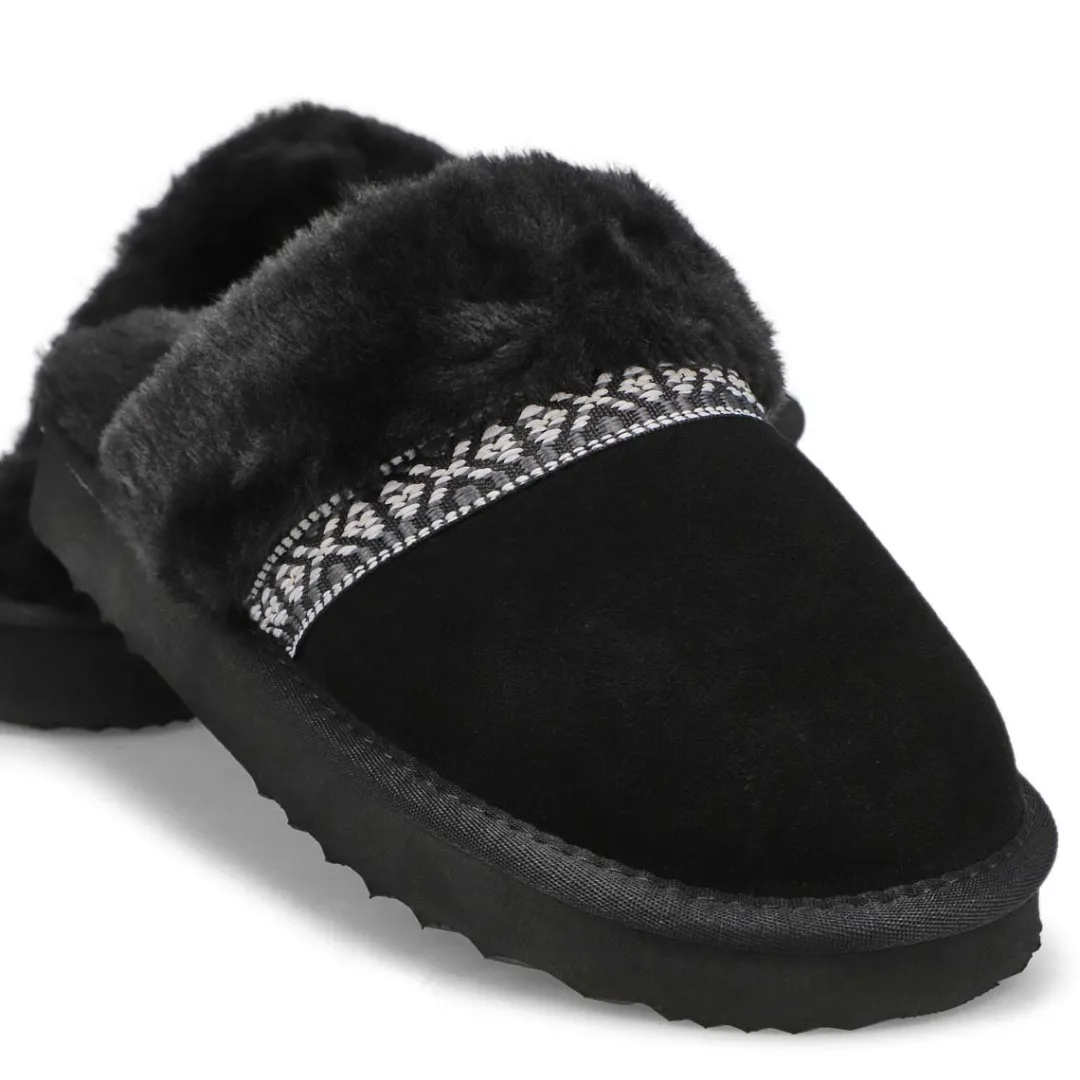 Warm and cozy. The Runabout open back black slipper from SoftMoc is perfect for those cold nights and mornings. Featuring a suede upper with a plush faux shearling collar for that cozy feeling. Memory foam footbed for added comfort. The Runabout open back suede slipper is design with a durable TPR outsole.