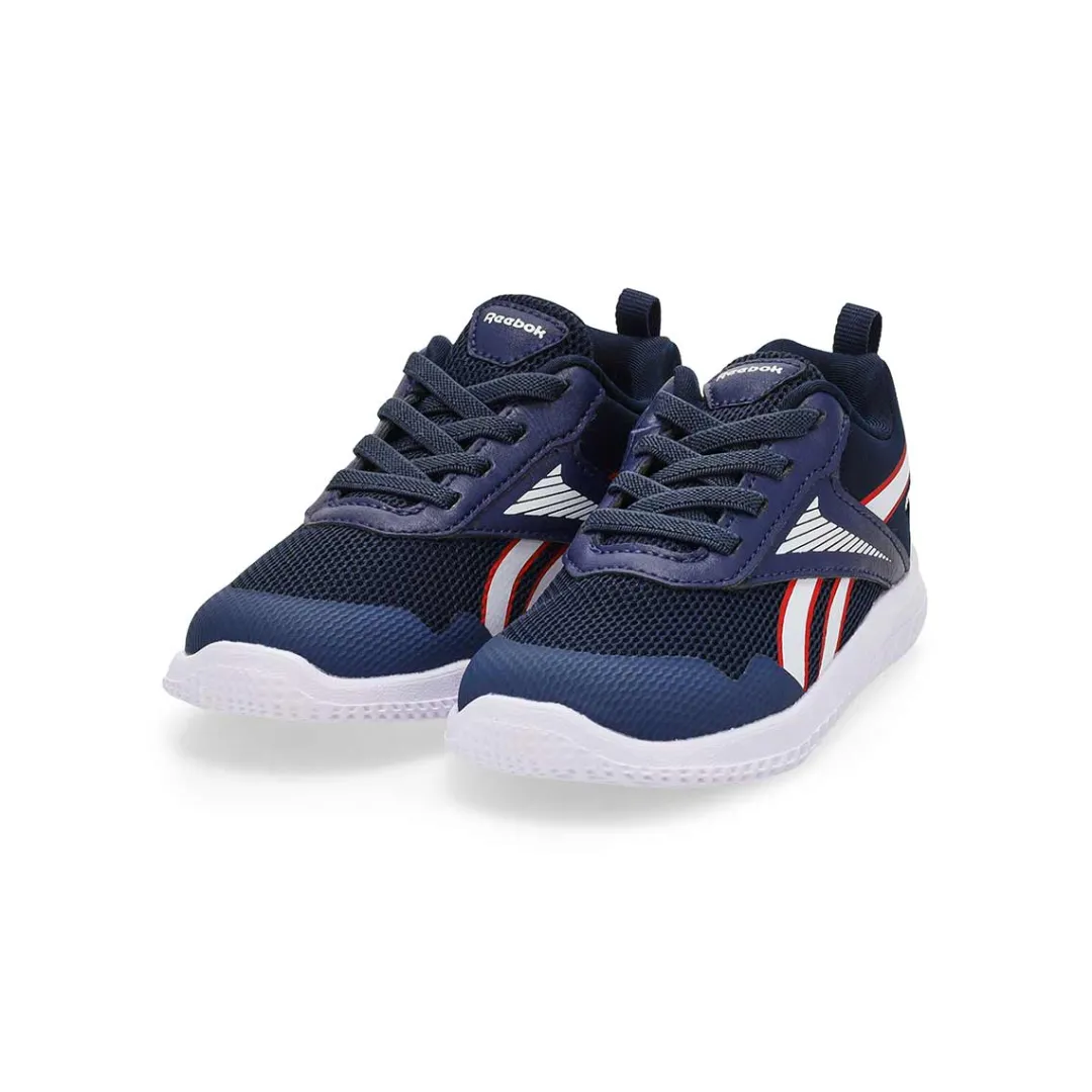 She plays hard. The Rush Runner dusty rose/ studio pink/ white sneaker from Reebok are built for support on the playground and beyond. The textile upper is lightweight and comfortable, and the iconic Vector logo adds athletic style. The EVA midsole provides underfoot cushioning for running, jumping and climbing. Durable rubber outsole.