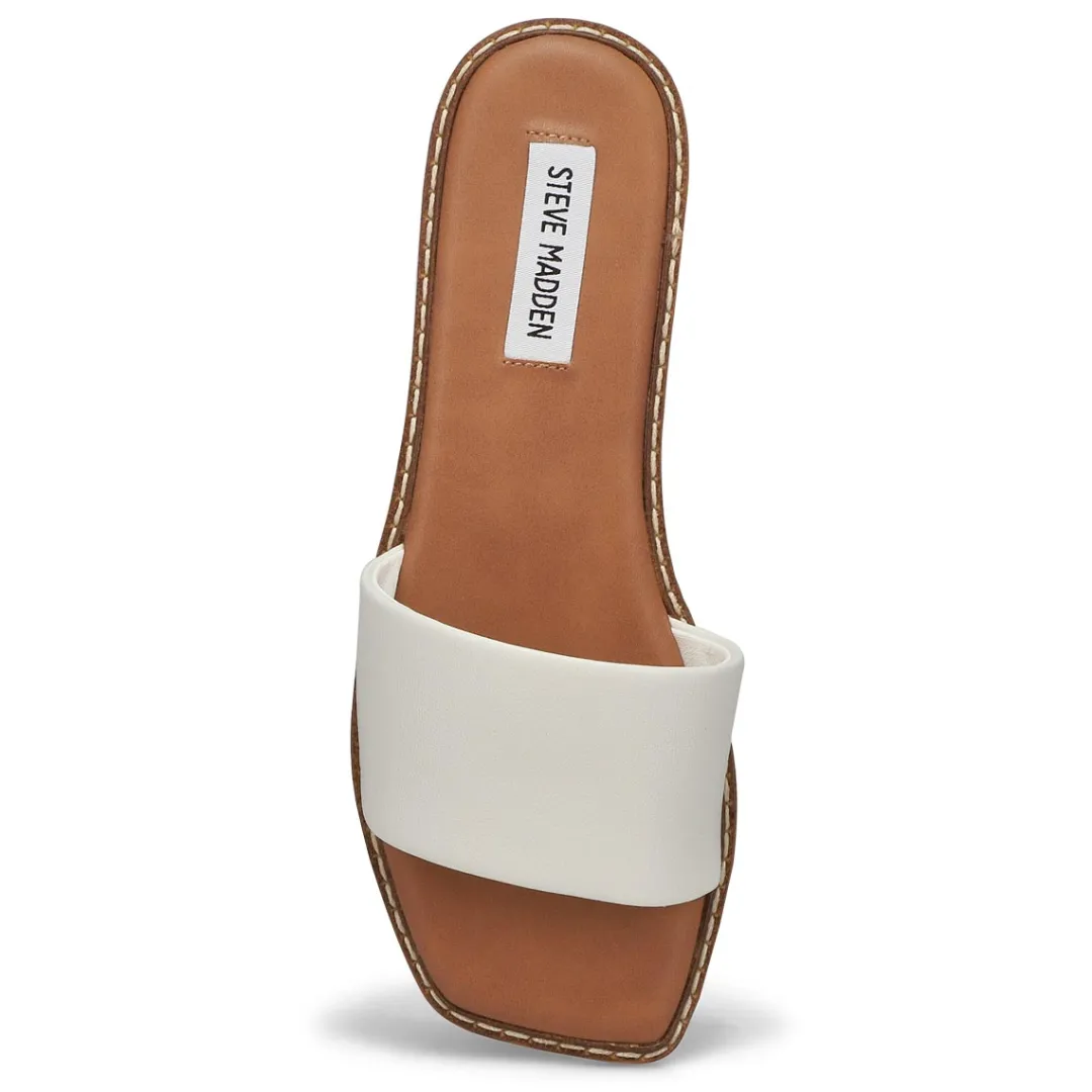 For versatility, style and comfort, Steve Madden has you covered with the Sabrina white slide sandal. Features a genuine leather upper. Slip on construction for easy on /off. Padded footbed for all day comfort and a flexible man-made outsole for great durability. The Sabrina slide is a must have for your wardrobe this season!