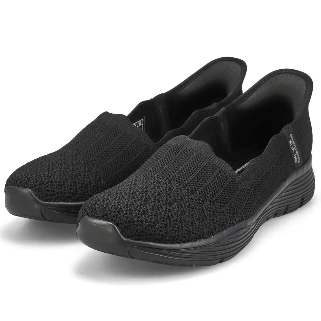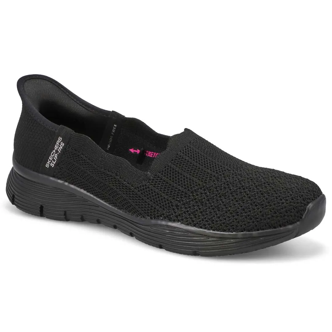 Make the call for sleek and versatile comfort in Skechers Hands Free Slip-ins Seager black /black shoe. Designed with Skechers Exclusive Heel Pillow to help hold your foot securely in place. This casual style features a Stretch Fit engineered knit upper with scalloped trim and a cushioned Skechers Air-Cooled Memory Foam insole.