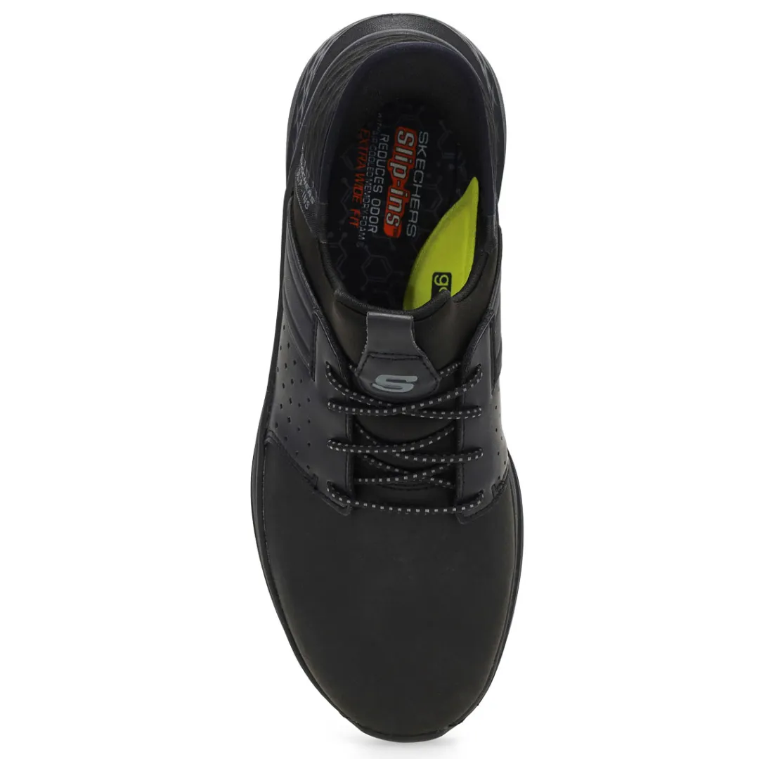 Sleek athletic style arrives with signature comfort in the Slip-ins Relaxed Fit: Slade Zachary black casual from Skechers. Designed with Skechers’ Exclusive Heel Pillow, this stretch-laced style features a leather and synthetic upper with a charcoal-infused Skechers Air-Cooled Memory Foam insole and Skechers Goga Mat Arch cushioning. Charcoal infused insole helps neutralize potential odor. Wide Width