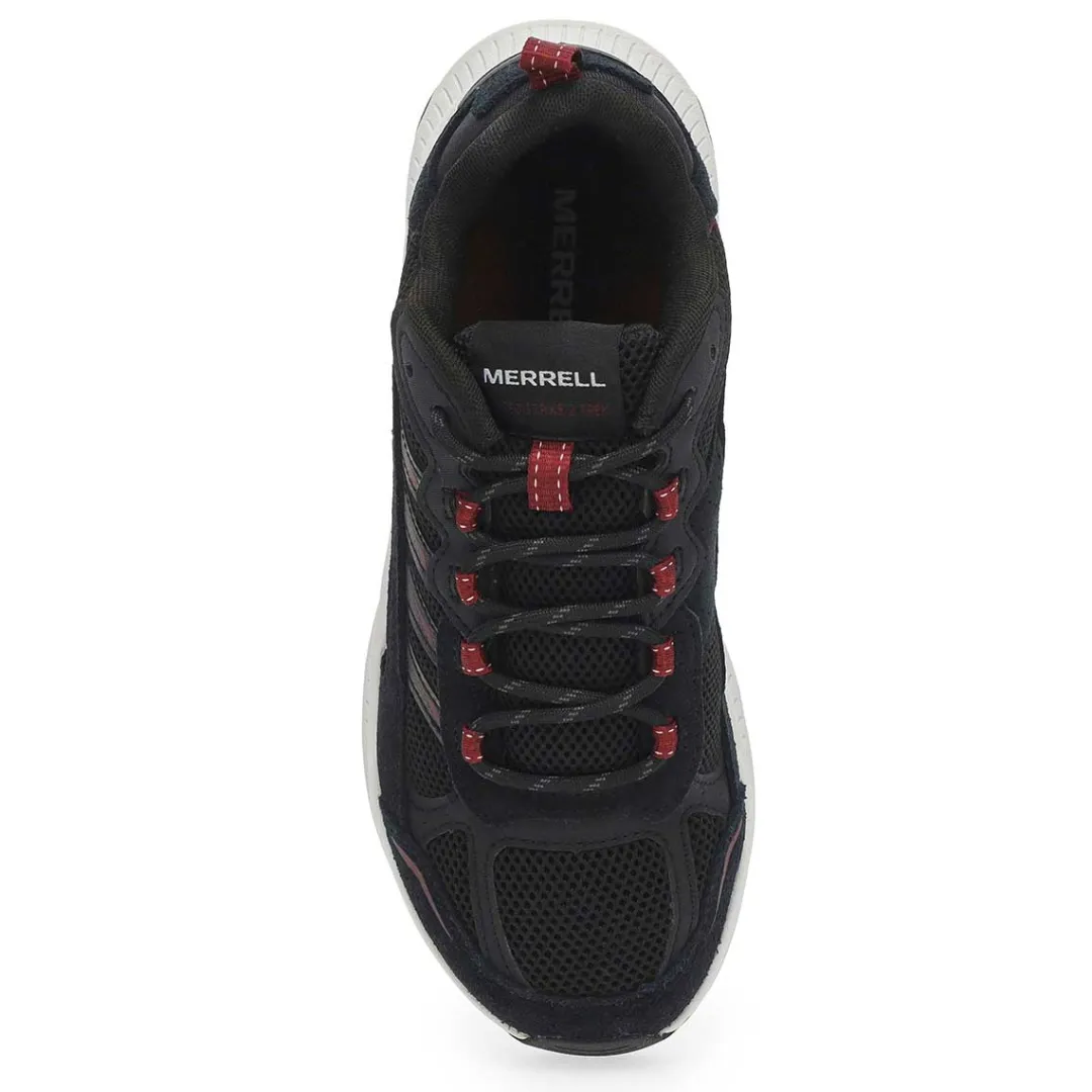 The Speed Strike 2 Trek black /cherry lace up hiking shoe from Merrell, pushes the Speed Strike franchise into a new realm. The styling and color make a statement for everyday wear. Featuring a breathable mesh, suede and synthetic upper. Recycled breathable mesh lining with heel pull tab webbing. Removable EVA footbed for all day comfort. Merrell sticky rubber outsole with durable traction that grips when and where you need it.