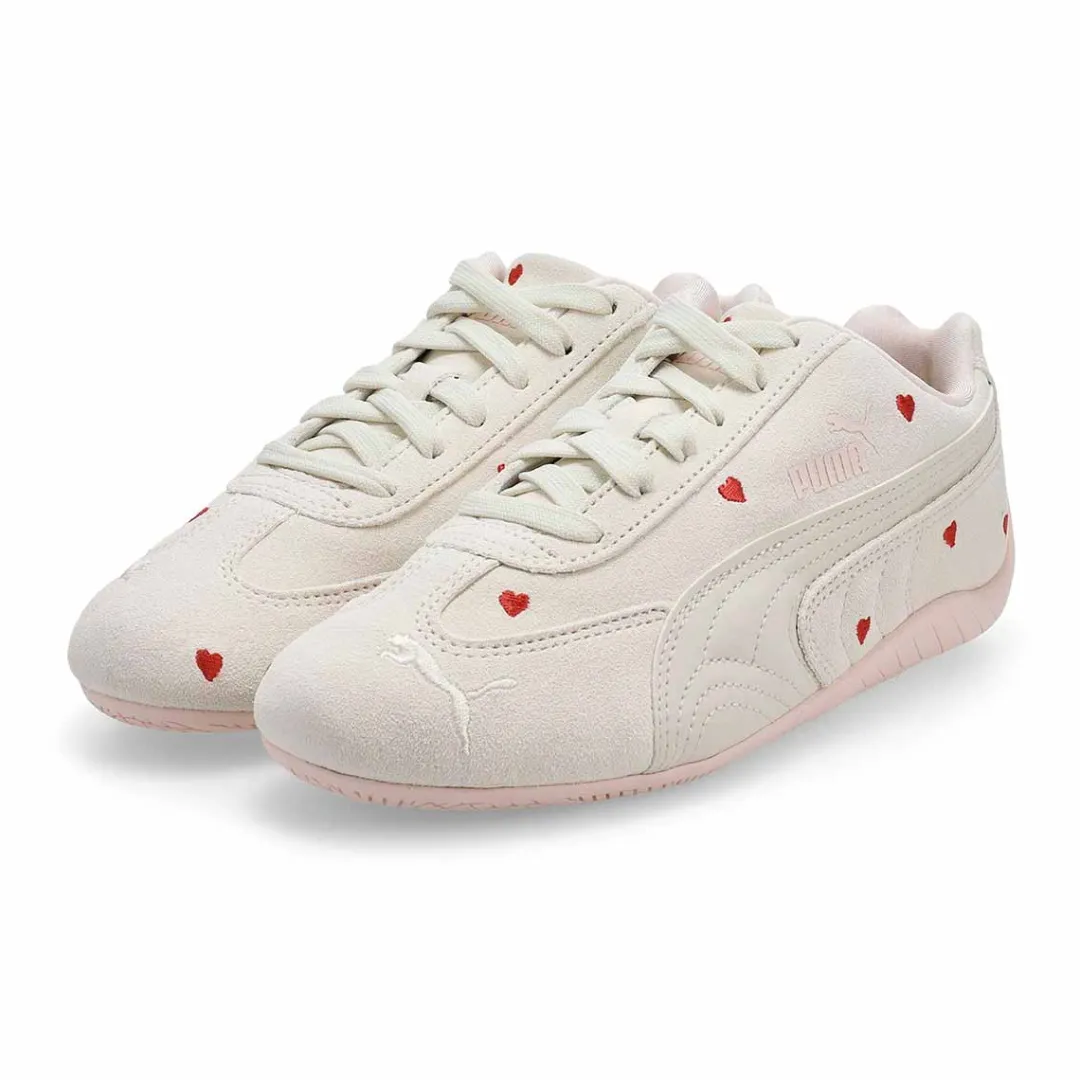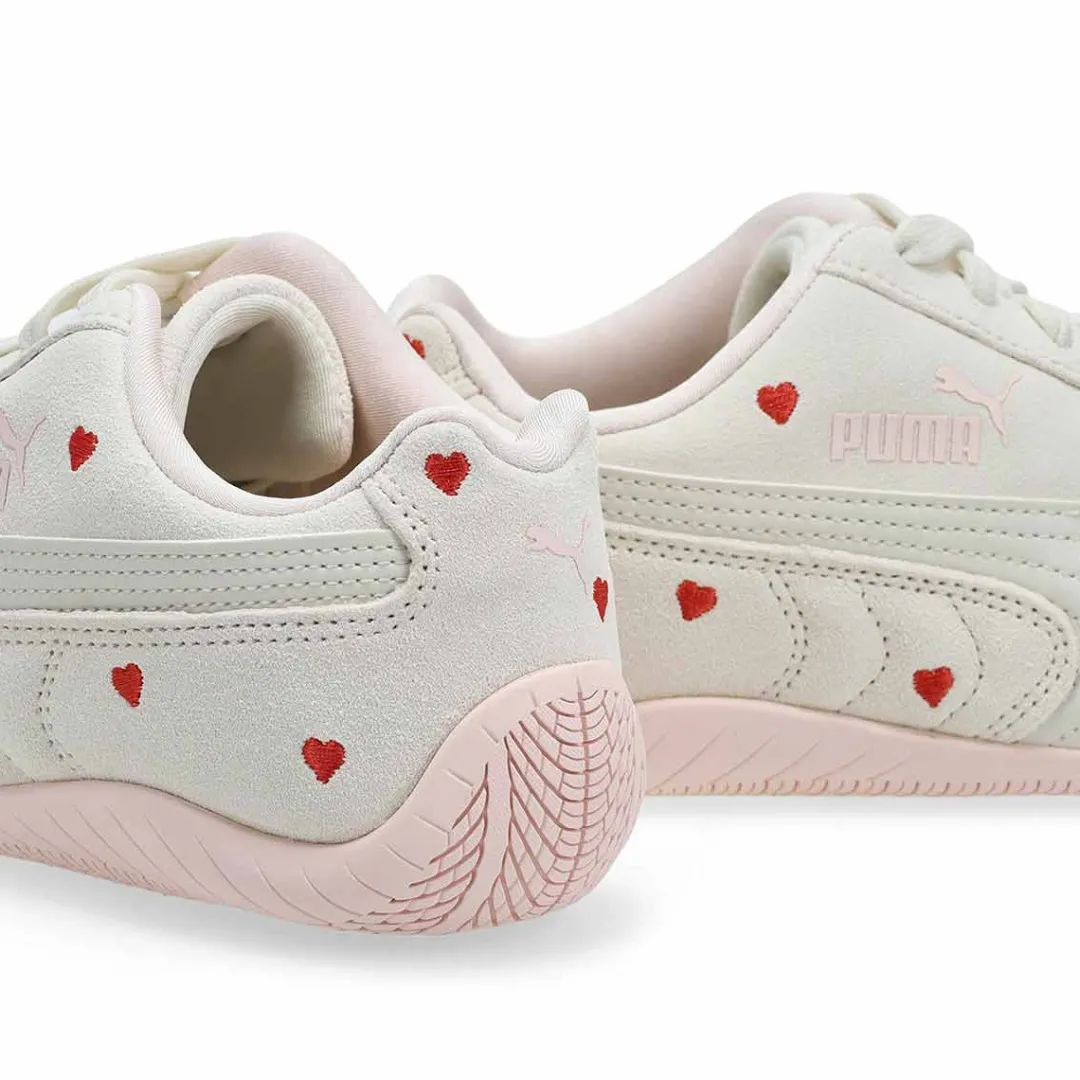 Kids will fall in love with this heart-print version of the Speedcat. Amor vapor grey/Jasmine low profile sneaker from Puma. A classic inspired by the speed of the racetrack, the Speedcat stands out from the crowd with its race-shoe-inspired shape and fast look. Small embroidered hearts make this take on the icon an instant charmer.
