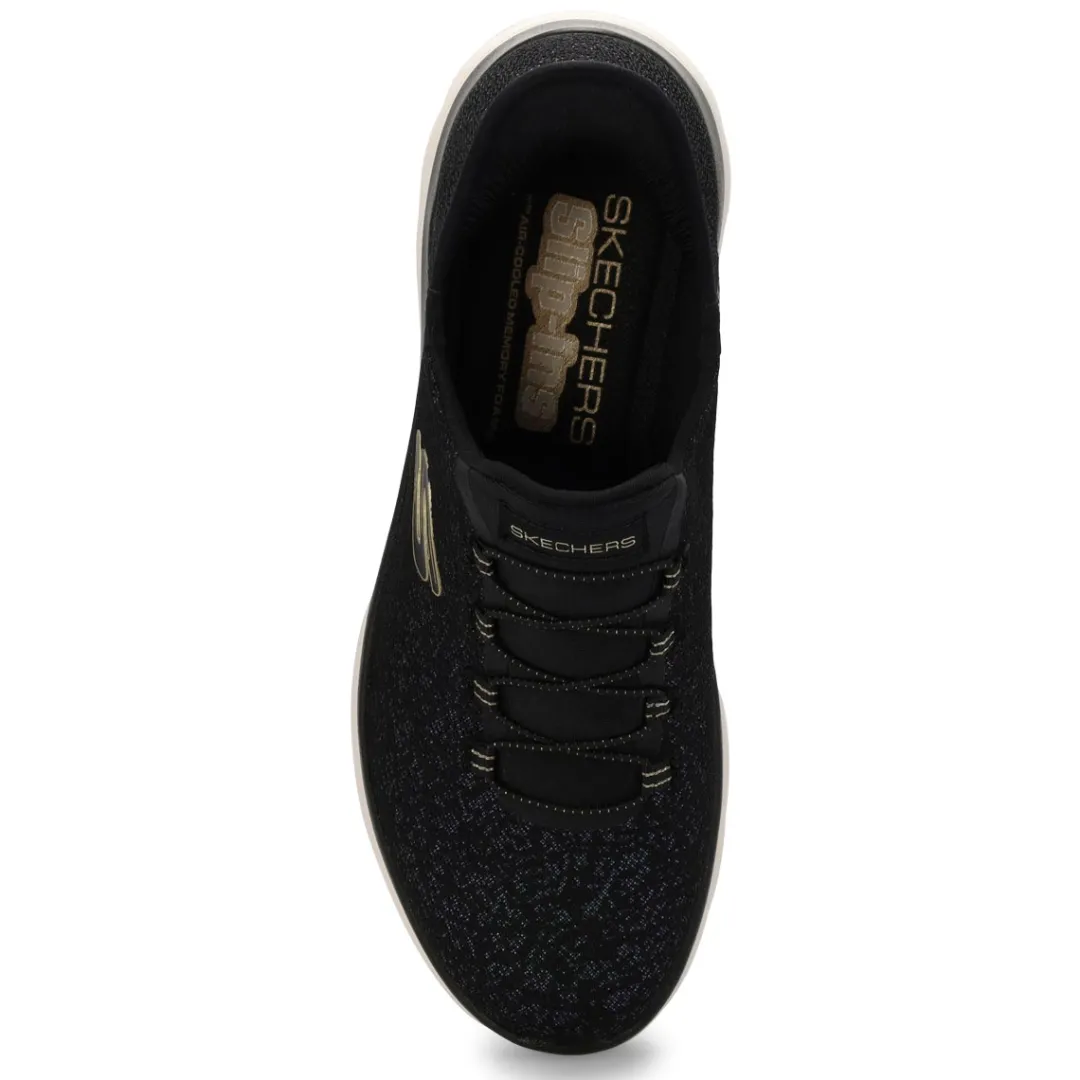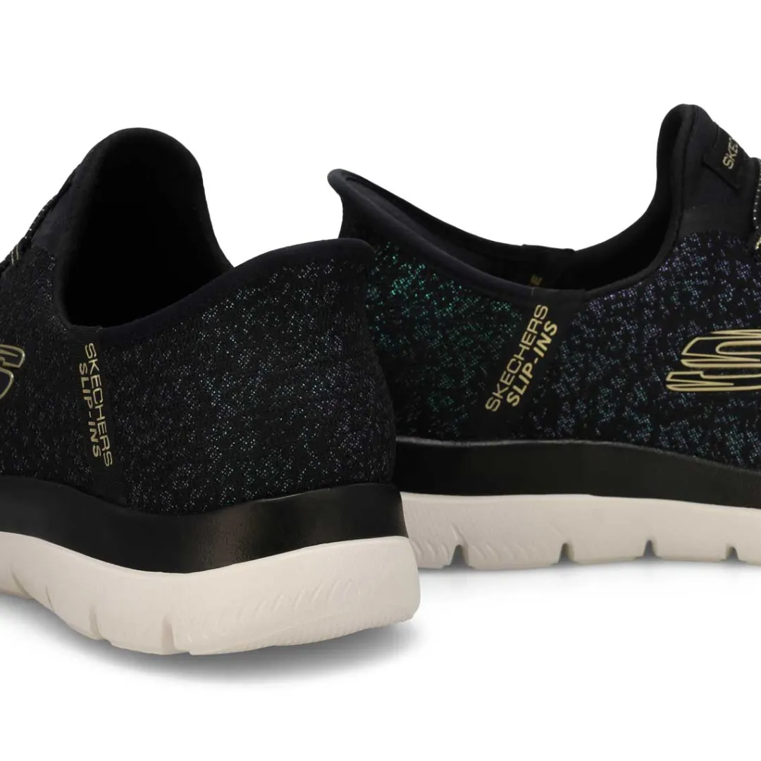 Add some shimmer to every step wearing the Slip-ins: Summits Lunar Glow black/ gold sneaker from Skechers. Designed with Skechers’ exclusive Heel Pillow helps hold your foot securely in place. This vegan slip-on features an iridescent mesh upper with fixed stretch laces and a cushioned Skechers Air-Cooled Memory Foam comfort insole.