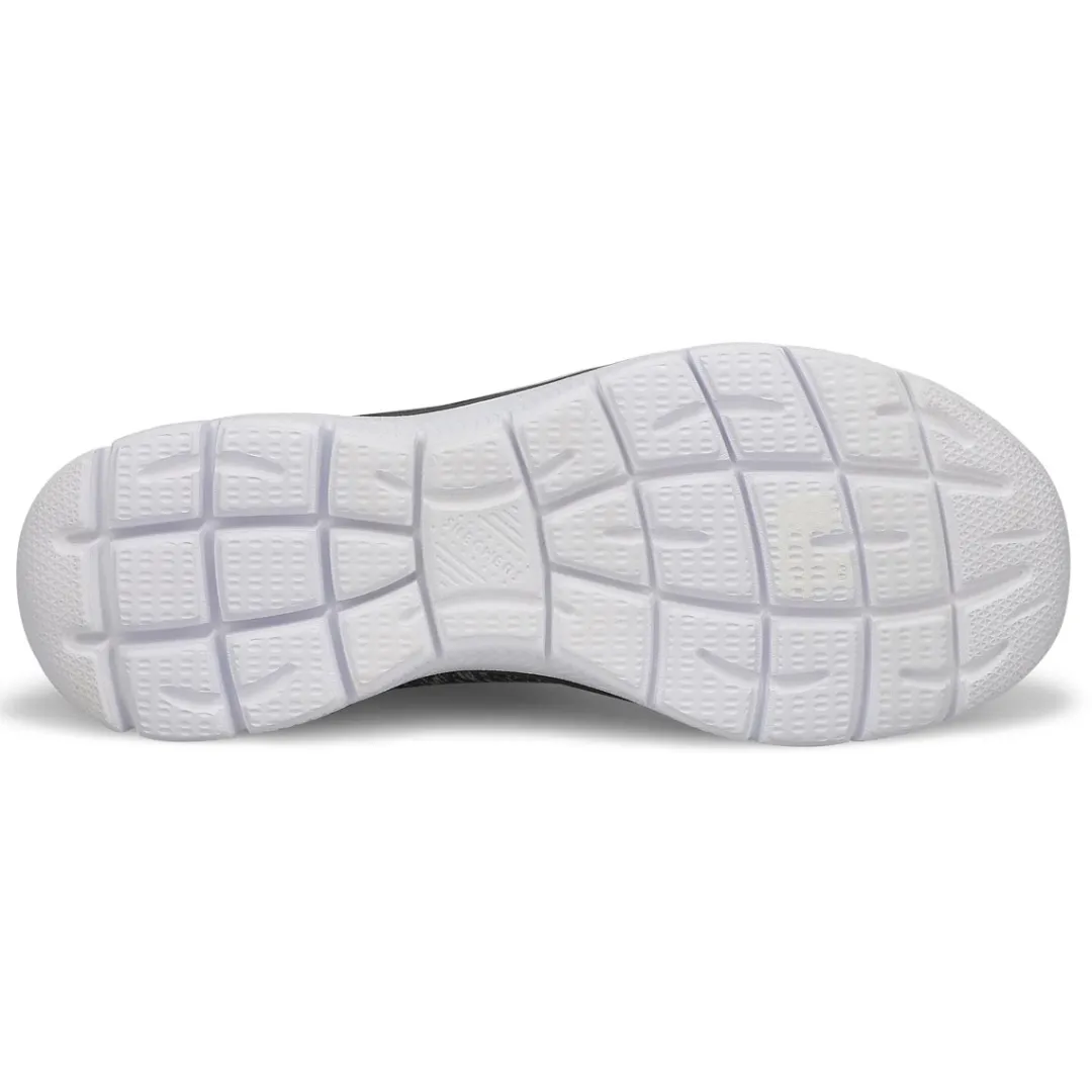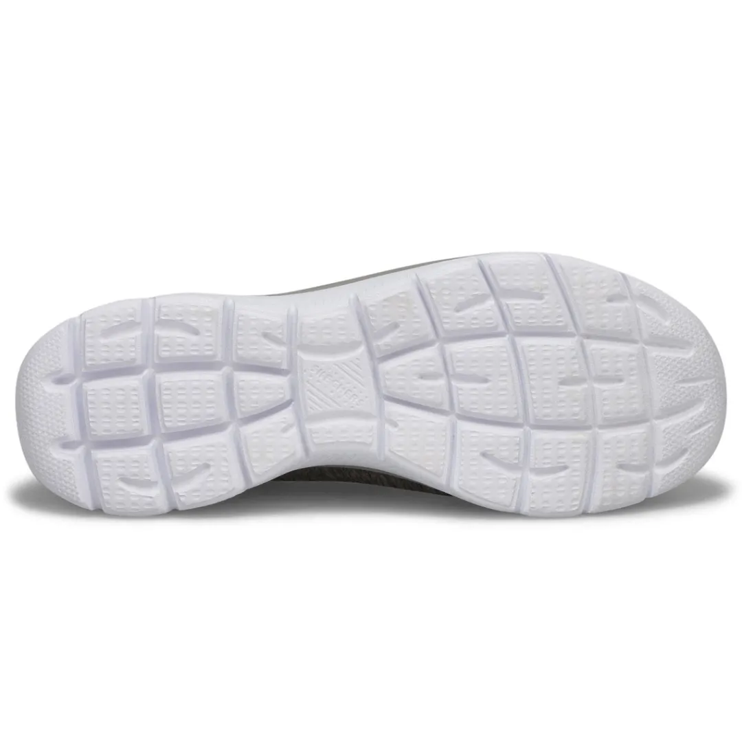 Get right to the sporty style and comfort wearing the Quick Getaway charcoal/ purple slip on from Skechers. Features a Jersey knit mesh nearly one piece upper in a Nearly seamless upper design. Slip on bungee front athletic training sneaker design. Soft fabric shoe lining with a Memory Foam full length cushioned comfort insole for all day comfort.
