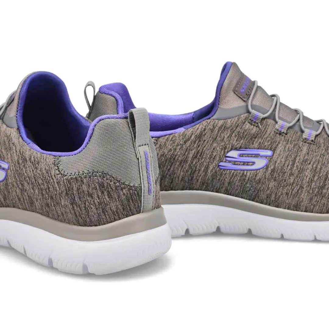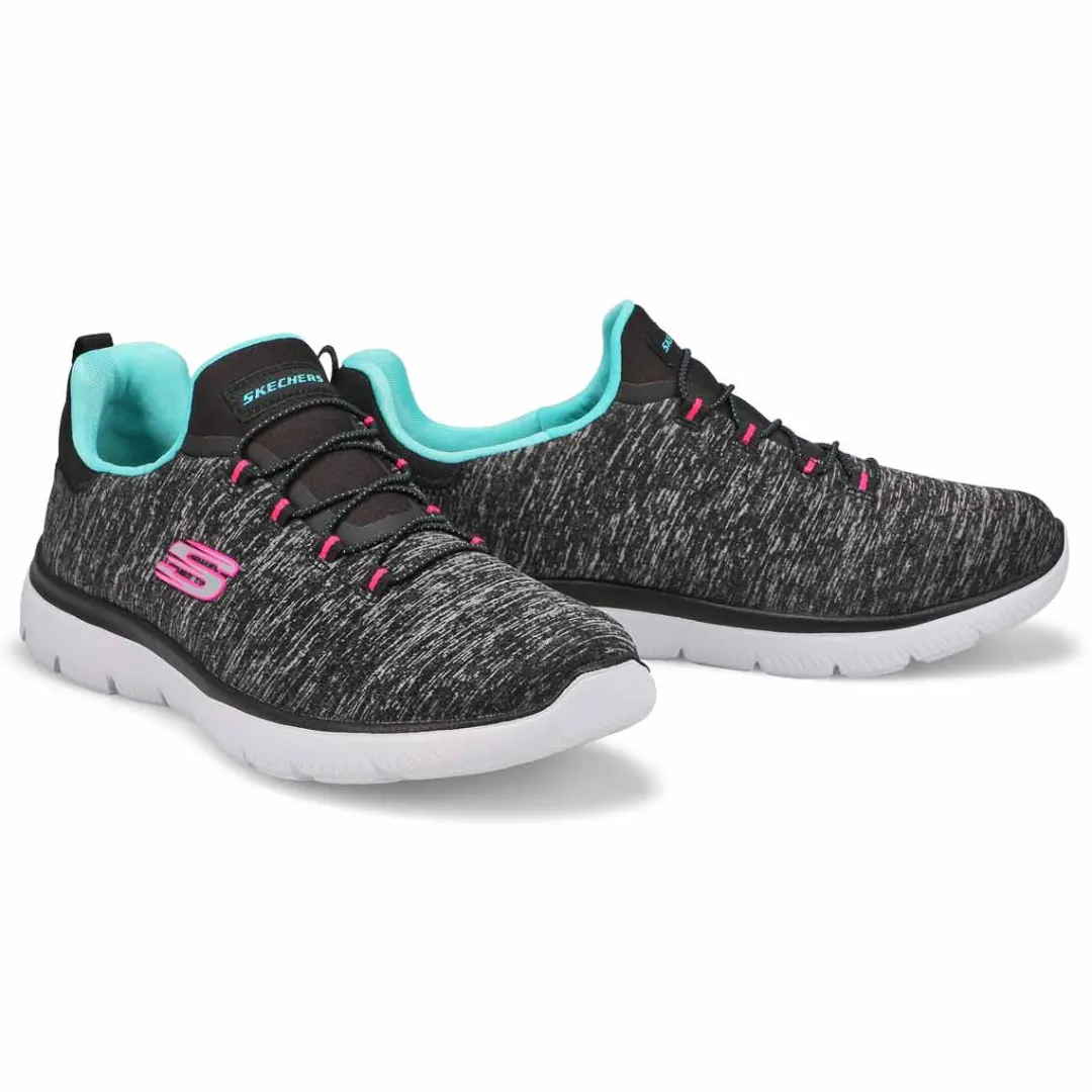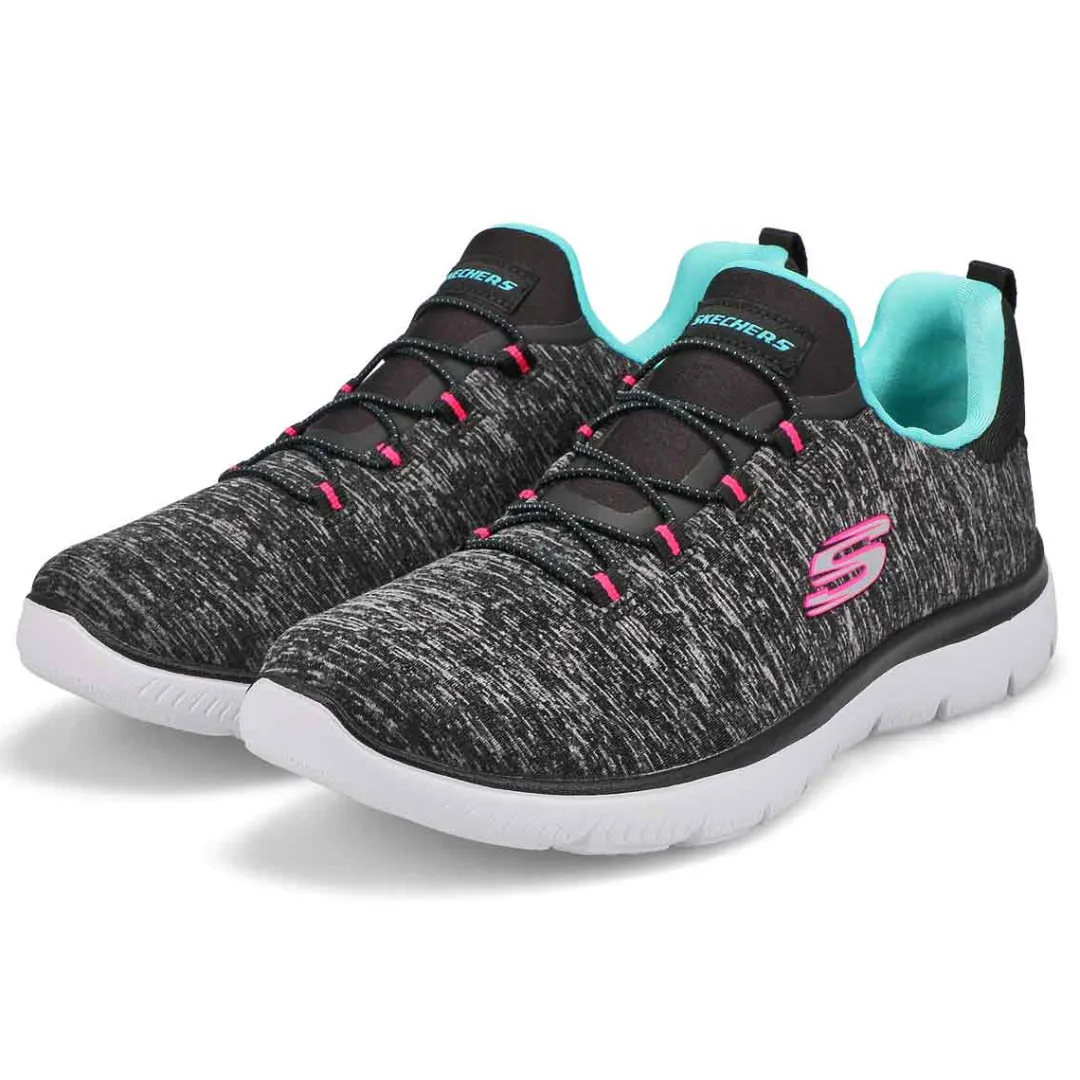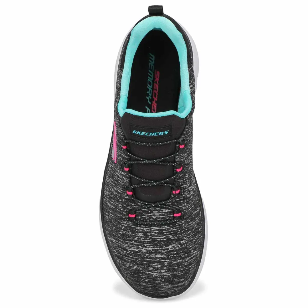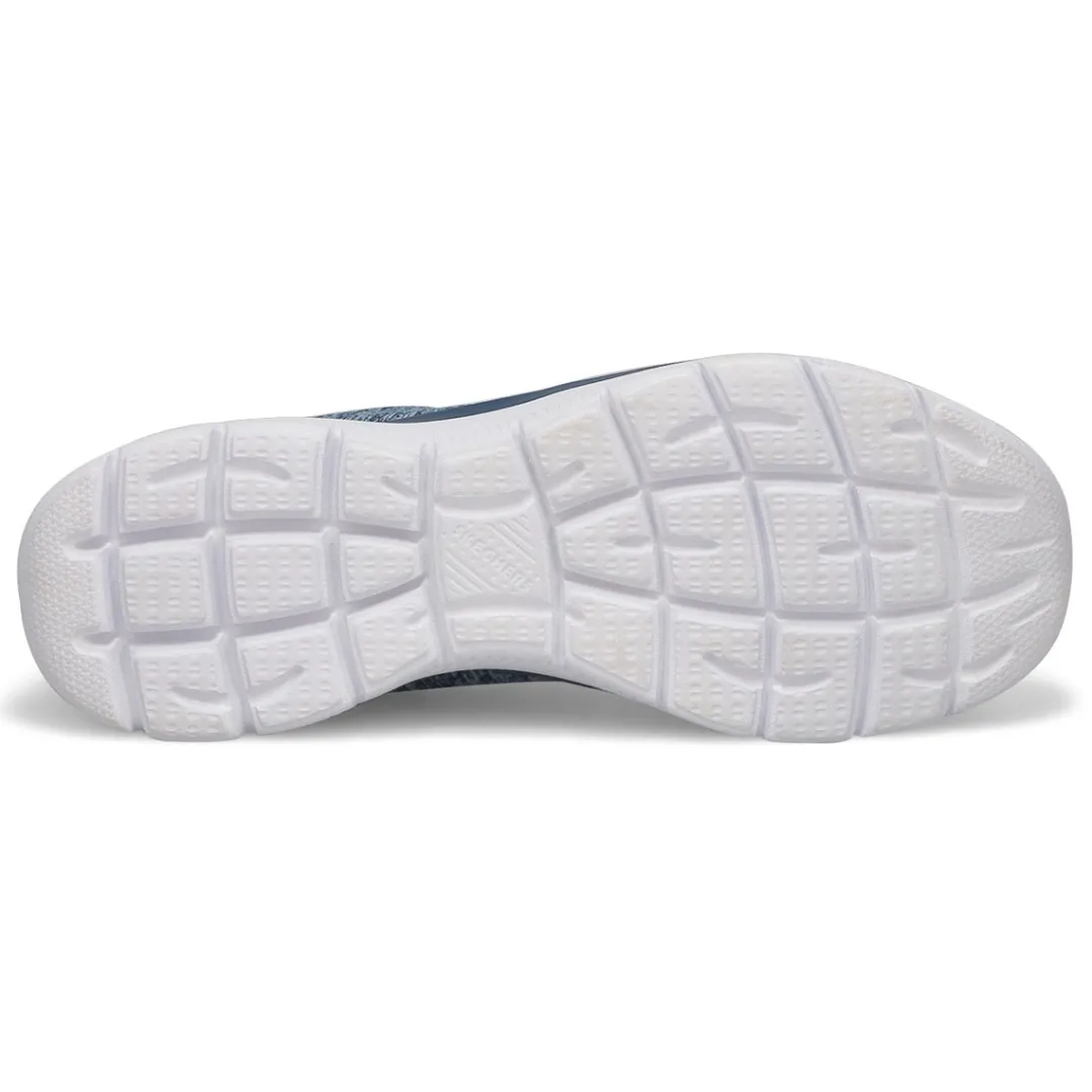 Get right to the sporty style and comfort wearing the Quick Getaway navy/ pink slip on from Skechers. Features a Jersey knit mesh nearly one piece upper in a Nearly seamless upper design. Slip on bungee front athletic training sneaker design. Soft fabric shoe lining with a Memory Foam full length cushioned comfort insole for all day comfort.