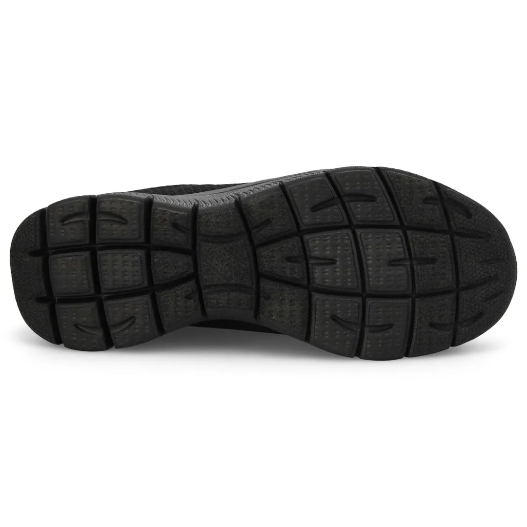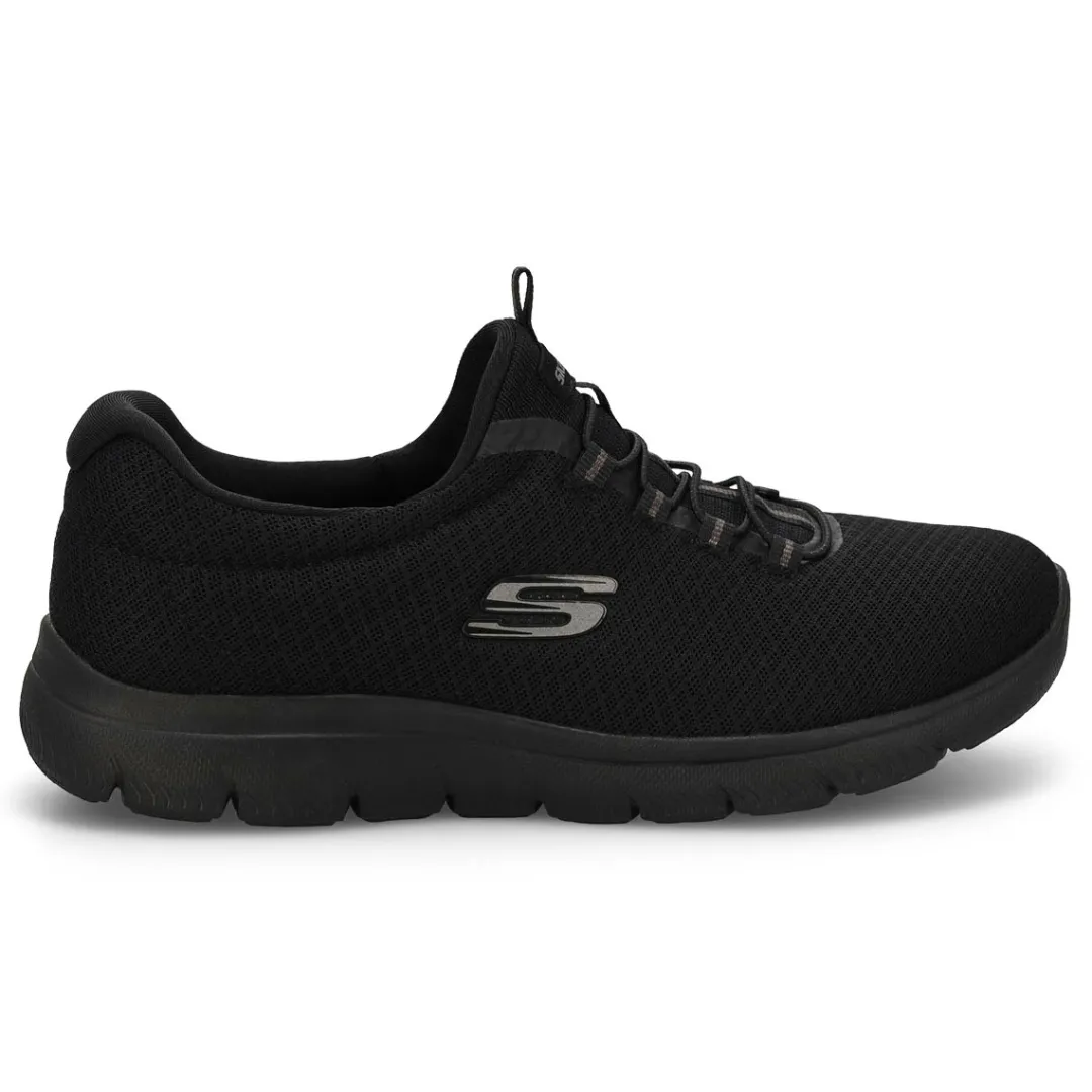 Get right to the sporty style and comfort wearing the Summits black slip on from Skechers. Features a Jersey knit mesh nearly one piece upper in a nearly seamless upper design. Slip on bungee front athletic training sneaker design. Soft fabric shoe lining with a Memory Foam full length cushioned comfort insole for all day comfort. Wide Width.