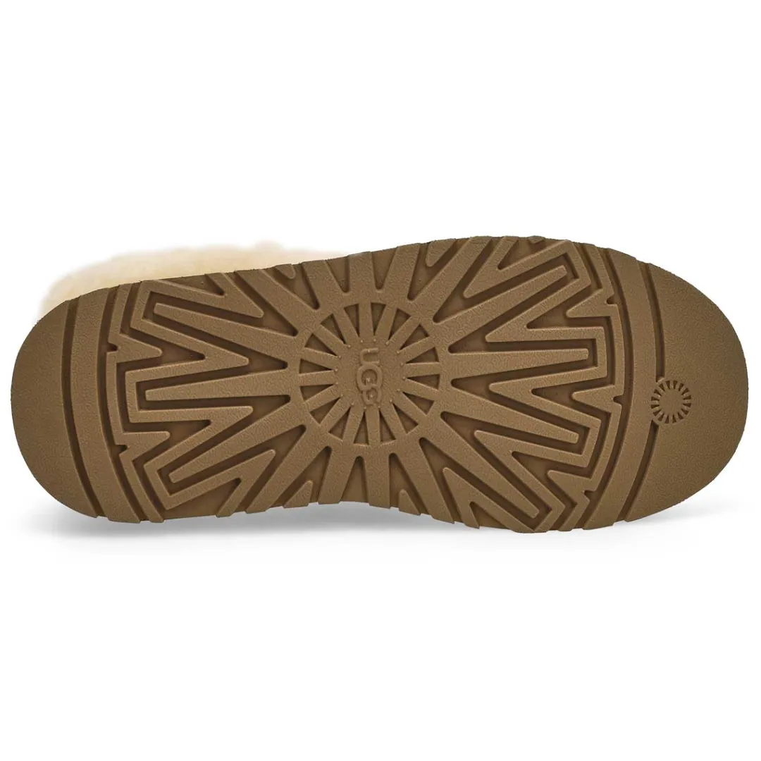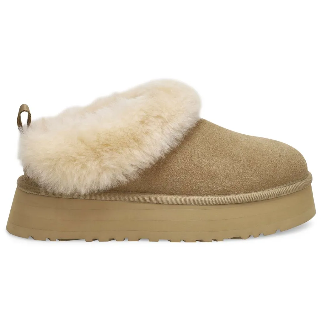 Love the Tazz but want even more UGG coziness? The Tazzelle chestnut platform slipper is the one for you. This ultra-plush indoor-outdoor slipper features genuine suede and a lightweight 1.75 inch platform made from springy sugarcane EVA. Sheepskin lines the interior and continues onto the lush fixed cuff, so you can wear these with socks, or without.