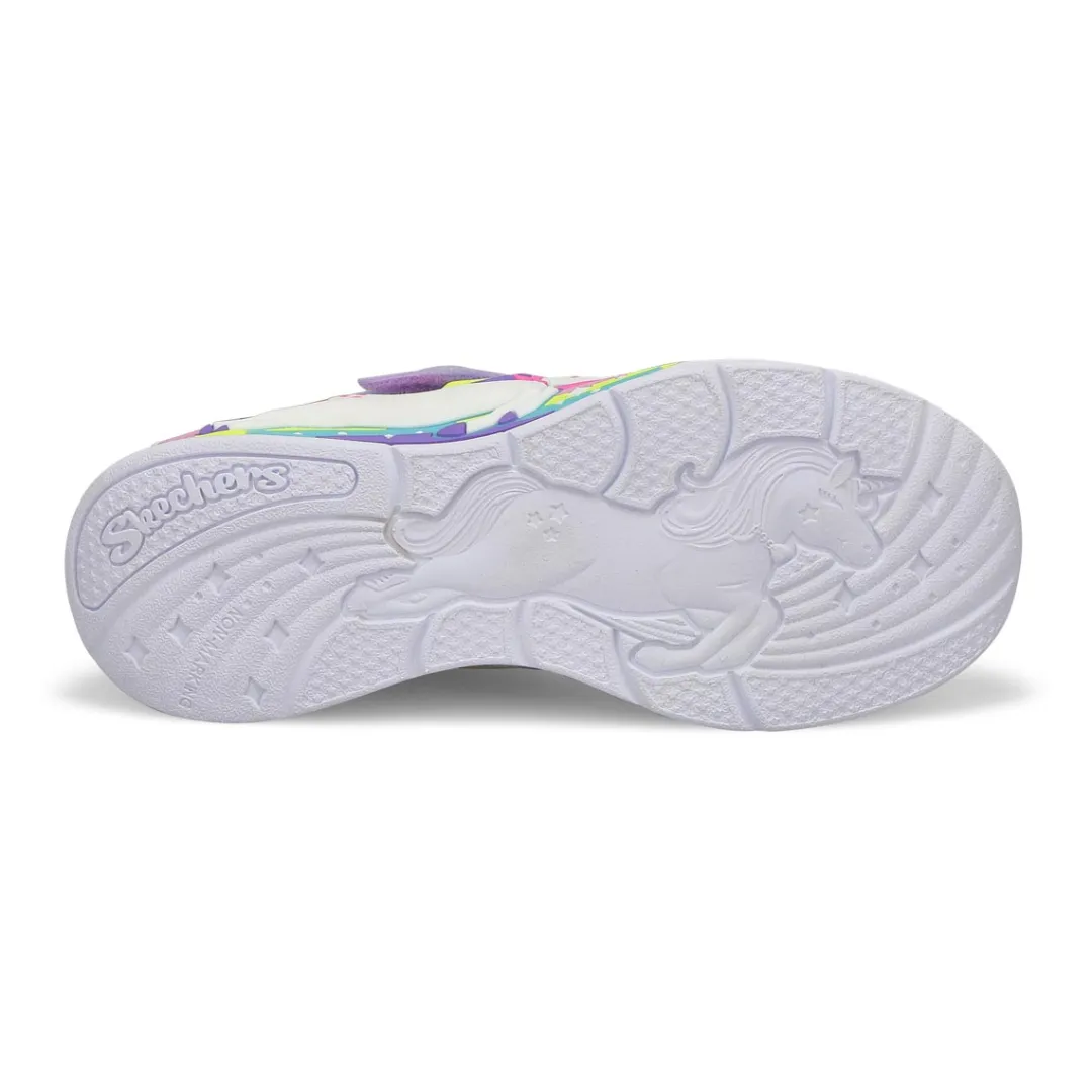 Sparkle and shine in style wearing thes S-Lights Unicorn Chaser lavender/ multi sneaker from Skechers. This sporty Magical Collection lighted design features a synthetic glitter finish upper with unicorn and rainbow side graphic. stretch laces with an adjustable instep strap for a secure fit, and a cushioned comfort footbed. On/off light button.
