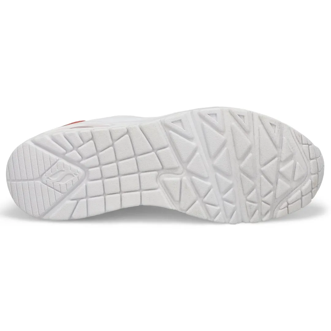 Make a stylish statement in comfort wearing the Uno- Pop Back white/ mint lace up sneaker from Skechers. This lace-up fashion jogger features a durabuck upper with contrast suede trim, a Skech-Air visible airbag midsole, the Uno Pop Back sneaker from Skechers is designed with an Air-Cooled Memory Foam insole for all day comfort.