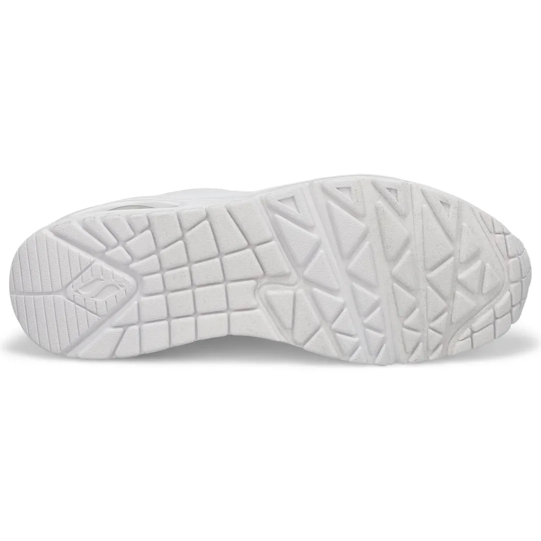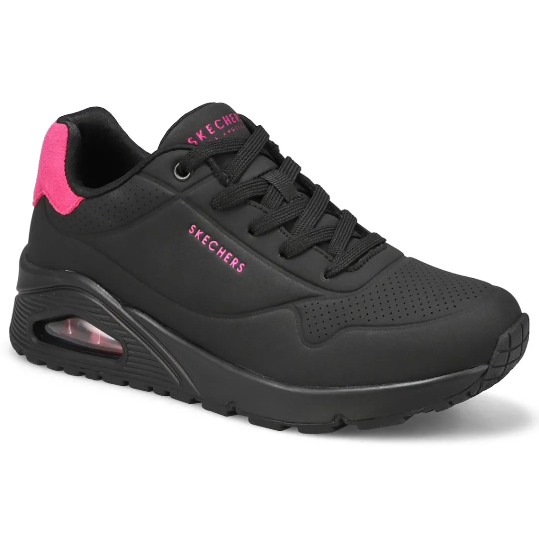 Make a stylish statement in comfort wearing the Uno- Pop Back black/ hot pink lace up sneaker from Skechers. This lace-up fashion jogger features a durabuck upper with contrast suede trim, a Skech-Air visible airbag midsole, the Uno Pop Back sneaker from Skechers is designed with an Air-Cooled Memory Foam insole for all day comfort.