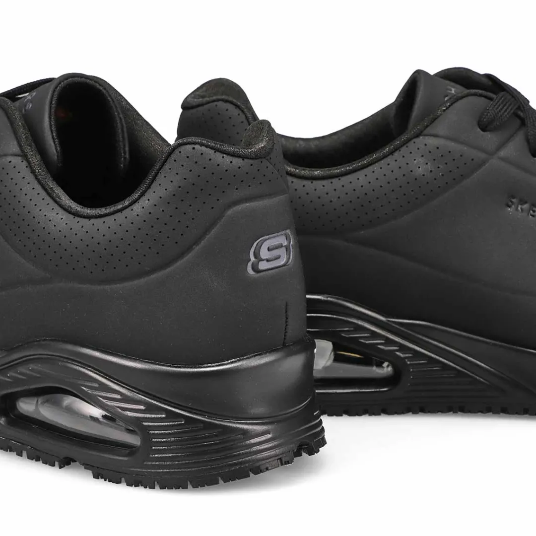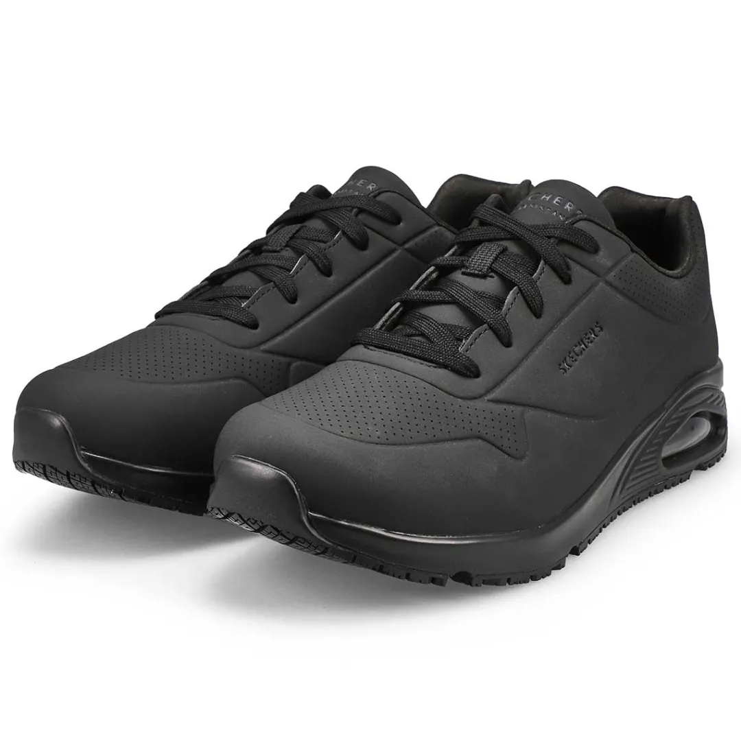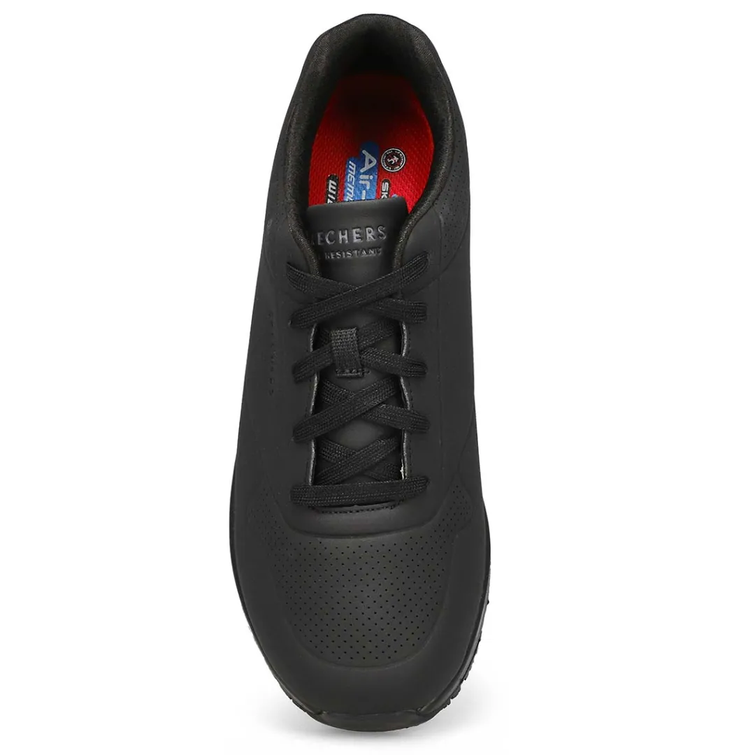 A favorite style arrives in comfort and safety with Skechers Work Relaxed Fit: Uno Slip Resistant black Sneaker. This slip resistant utility design features a durable perforated synthetic durabuck upper with a Skechers Air-Cooled Memory Foam insole and Skech-Air visible airbag midsole. Electrical Hazard (EH) safe design tested ASTM-F2892. Slip-resistant traction outsole. Wide Width.
