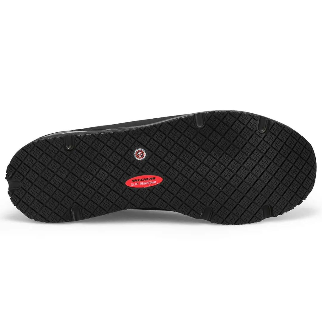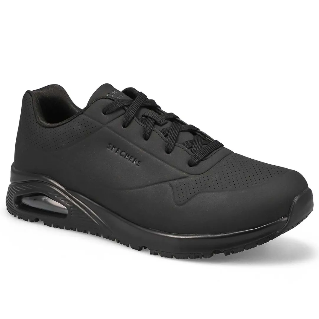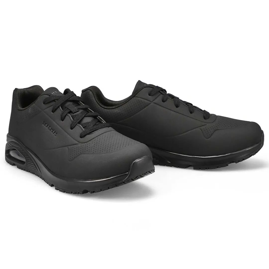 A favorite style arrives in comfort and safety with Skechers Work Relaxed Fit: Uno Slip Resistant black Sneaker. This slip resistant utility design features a durable perforated synthetic durabuck upper with a Skechers Air-Cooled Memory Foam insole and Skech-Air visible airbag midsole. Electrical Hazard (EH) safe design tested ASTM-F2892. Slip-resistant traction outsole. Wide Width.