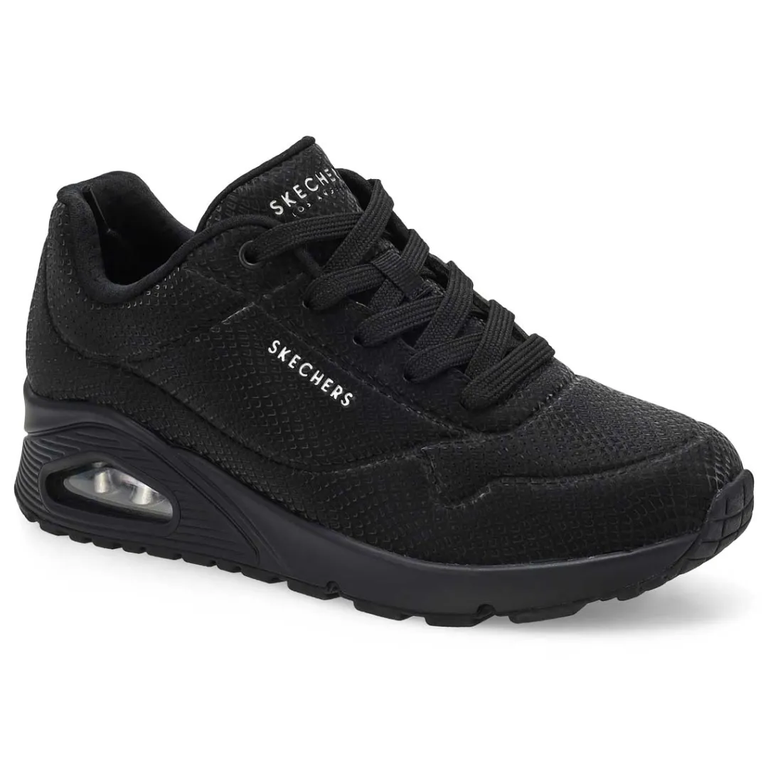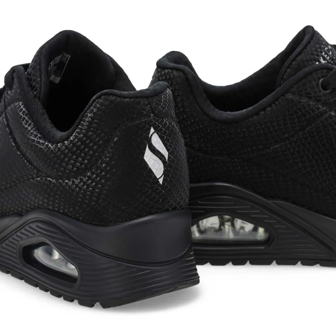 Walk on air in the wildly comfortable Street UNO Safari Time white/ leopard lace up sneaker from Skechers. This stretch-laced fashion sneaker features a duraleather upper with a leopard print midsole and lining, a Skechers Air-Cooled Memory Foam insole, and a visible Skech-Air airbag midsole. No Tie Fit – laces never come untied.