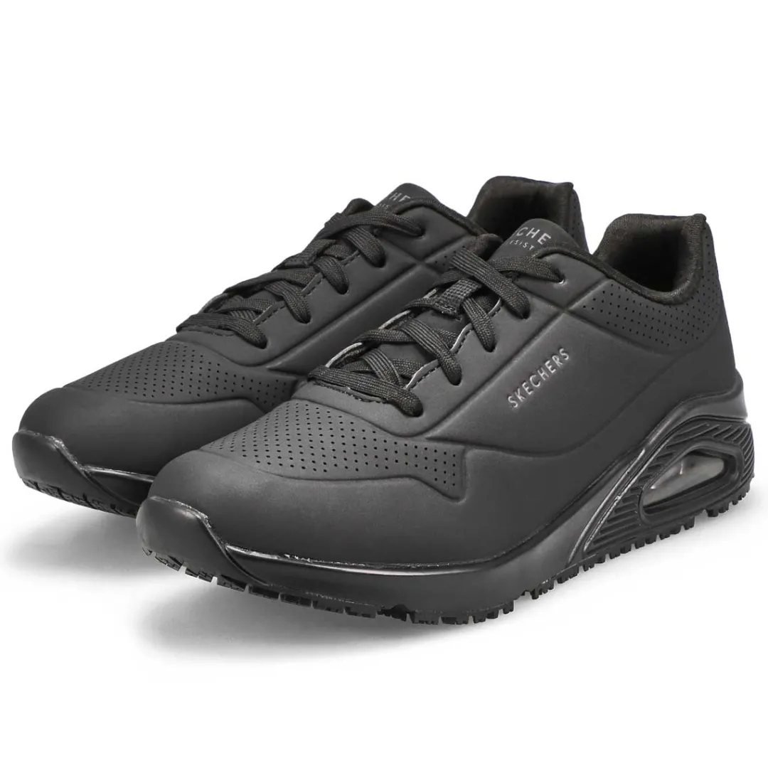 A favorite style arrives in comfort and safety with the Uno Slip Resistant Wide Sneaker from Skechers. This slip-resistant work design features a durable perforated synthetic durabuck upper with a Skechers Air-Cooled Memory Foam insole and Skech-Air visible air-cushioned midsole. Slip-resistant rubber traction outsole. EH Safe design tested ASTM F2892-11. Wide Width.