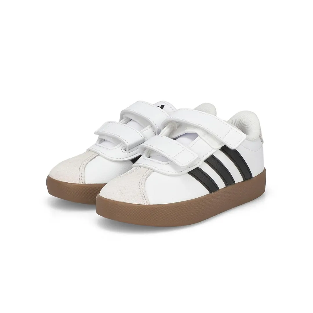 These infants’ Adidas VL Court 3.0 CF black/white/black sneakers are made for toddlers on the move. Whether they’re cruising on their first balance bike or exploring every inch of the playground, these skater-style kicks are the perfect choice. A faux leather upper with a soft suede toe cap offers durability and style, while hook-and-loop straps make these shoes easy to slip off when naptime arrives.
