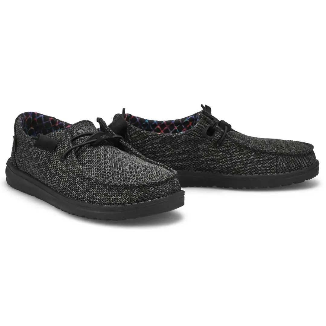 HEYDUDE’s iconic low-top moc with a custom look. Plus a little extra height and a little extra cushion. The Wendy Funk Mono Casual black shoe from HEYDUDE is still super lightweight. Easy-On system and their patented UltraLIGHT EVA outsole for superior comfort. Featuring contrasting textures and hand-stitching at the heel.