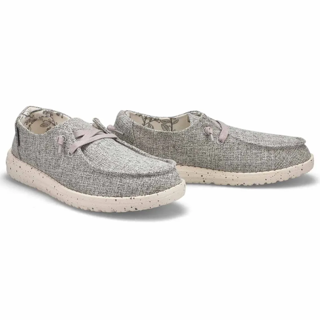 The Wendy Linen iron casual from HEYDUDE will be an instant favorite in your casual collection. Featuring a linen upper with a round toe design. Low-top, chukka construction with a soft, oxford cloth lining that surrounds the foot in comfort. Memory foam cushioned, removable insole. The Wendy Linen casual shoe is designed with an ultra-light, lugged synthetic outsole.