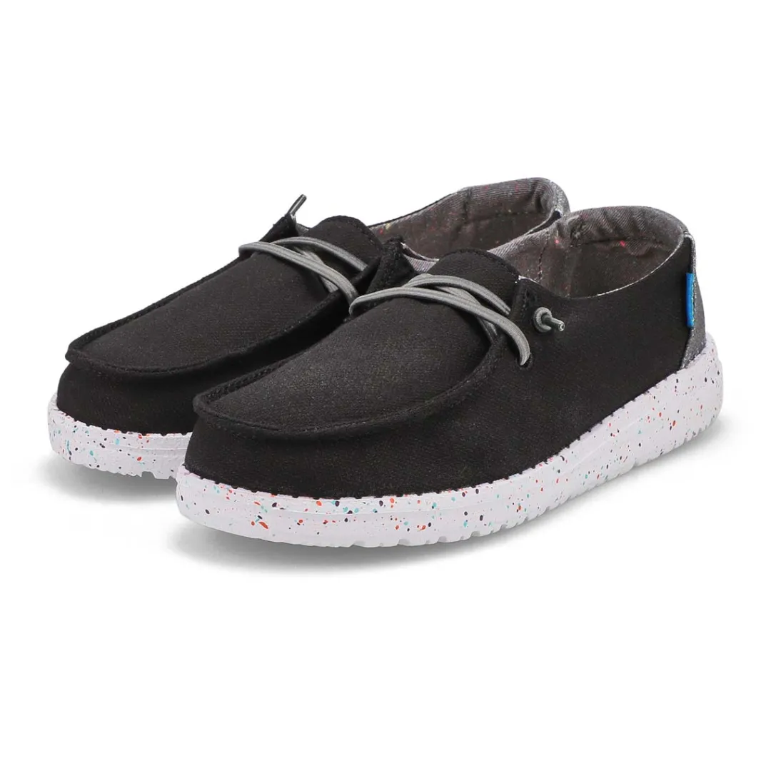 HEYDUDE’s iconic low-top moc with a custom look. Plus a little extra height and a little extra cushion. The Wendy Youth Casual disco black shoe from HEYDUDE is still super lightweight. Easy-On system and their patented UltraLIGHT EVA outsole for superior comfort. Featuring contrasting textures and hand-stitching at the heel.